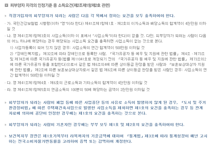 직장가입자의 피부양자가 되려는 사람은 다음 각 목에서 정하는 요건을 모두 충족하여야 한다.