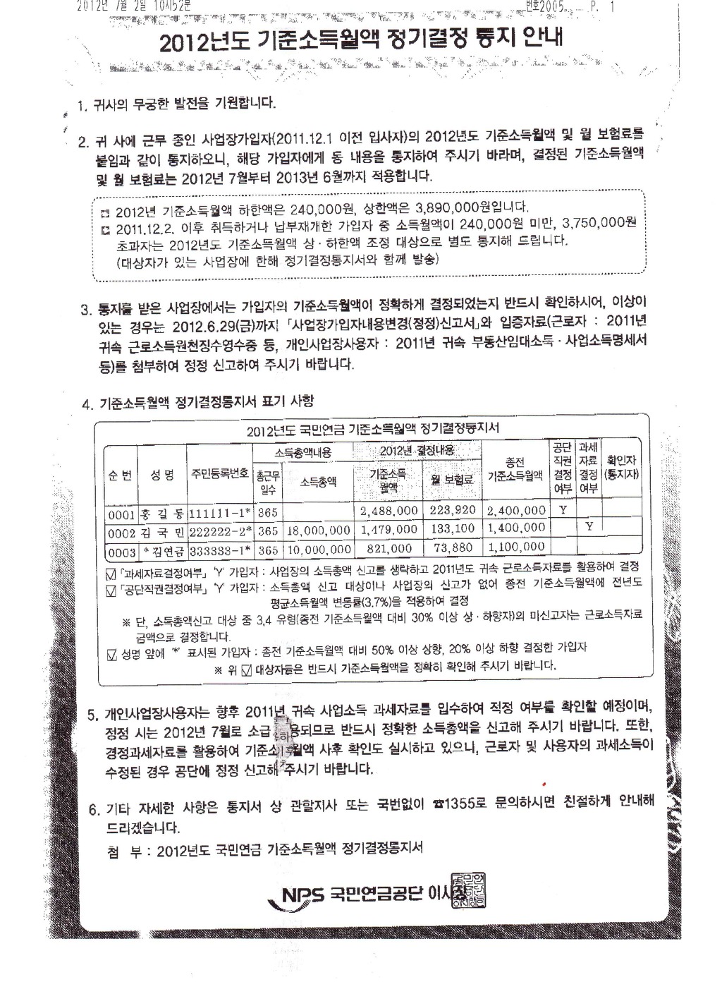 첨 부 : 2012년도 국민연금 기준소득월액 정기결정통지서