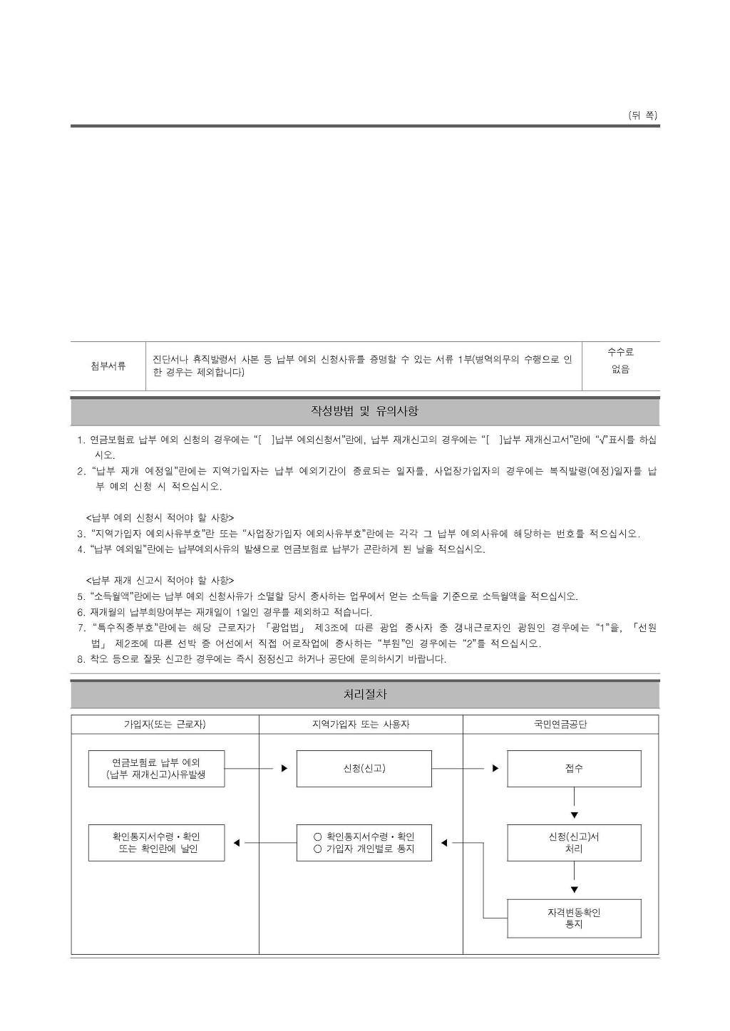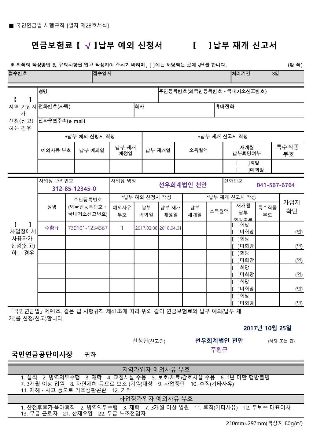 연금보험료납부예외신청서 , 납부재개신고서 , 국민연금보험료납부예외신청서 , 국민연금납부재개신고서 작성자EYEDI|작성시간17.10.25|조회수1,301 목록 댓글 0 글자크기 작게가 글자크기 크게가 연금보험료 납부 예외 신청서 납부 재개 신고서.xlsx 두루누리 보험료지원신청서 (2018-08-08).xlsx국민연금법 시행규칙 [별지 제28호서식] 첨부파일첨부된 파일이 6개 있습니다. jpg 파일 연금보험료 납부 예외 신청서 납부 재개 신고서.jpg 다운로드 jpg 파일 사업장가입자 납부예외재개 신고서 (1)_Page_2.jpg 다운로드 xlsx 파일 연금보험료 납부 예외 신청서 납부 재개 신고서.xlsx 다운로드 jpg 파일 납부예외.jpg 다운로드 png 파일 납부예외 추가납부.png 다운로드 xlsx 파일 두루누리 보험료지원신청서 (2018-08-08).xlsx 다운로드 다음검색 현재 게시글 추가 기능 열기 북마크 공유하기 신고 센터로 신고 댓글 댓글 0 댓글쓰기 답글쓰기 댓글 리스트