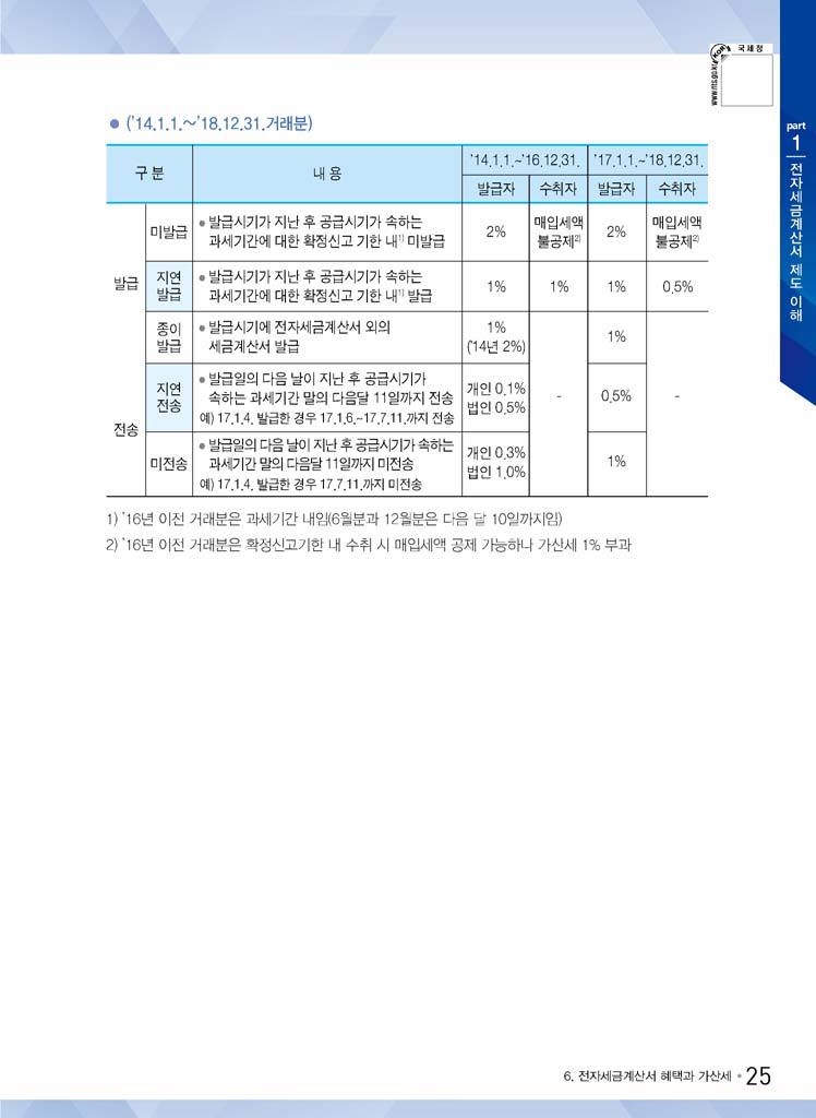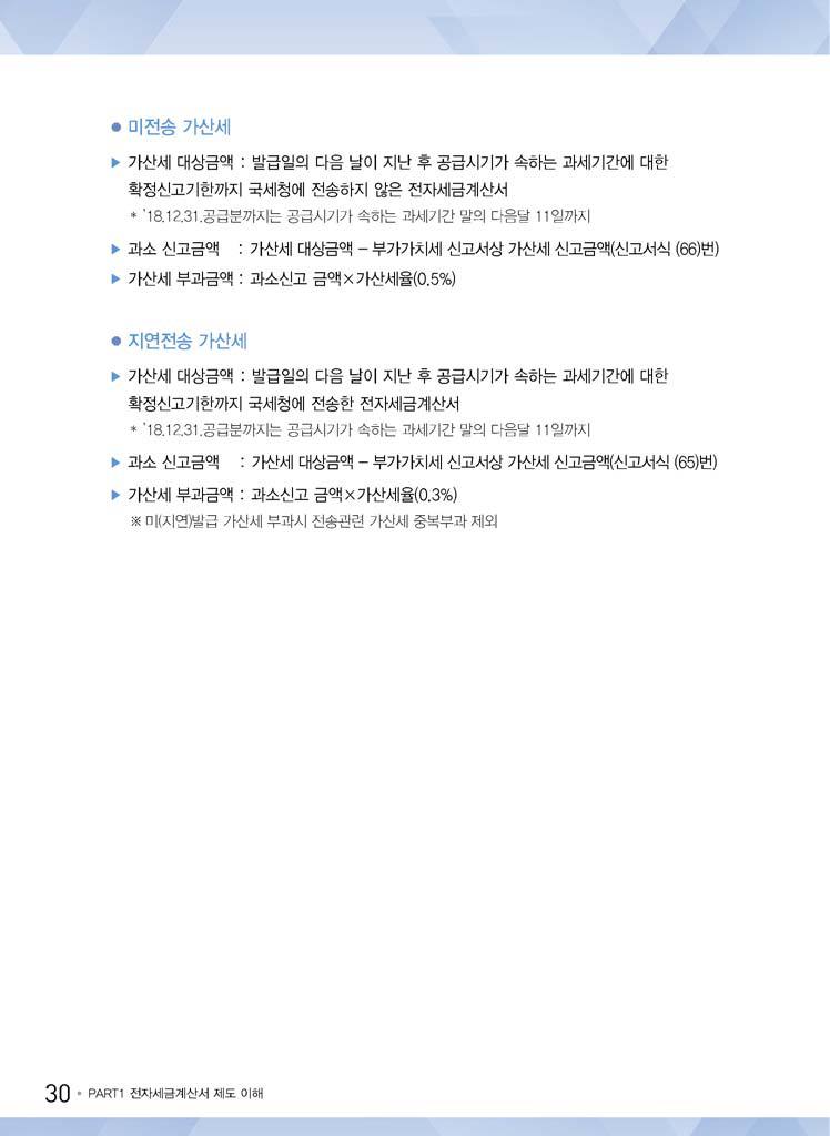 4. 제32조[세금계산서 등] 제3항에 따른 기한이 지난 후 재화 또는 용역의 공급시기가 속하는 과세기간에 대한 확정신고기한까지 국세청장에게 전자세금계산서 발급명세를 전송하지 아니한 경우 그 공급가액의 0.5퍼센트(2018.12.31 개정)
