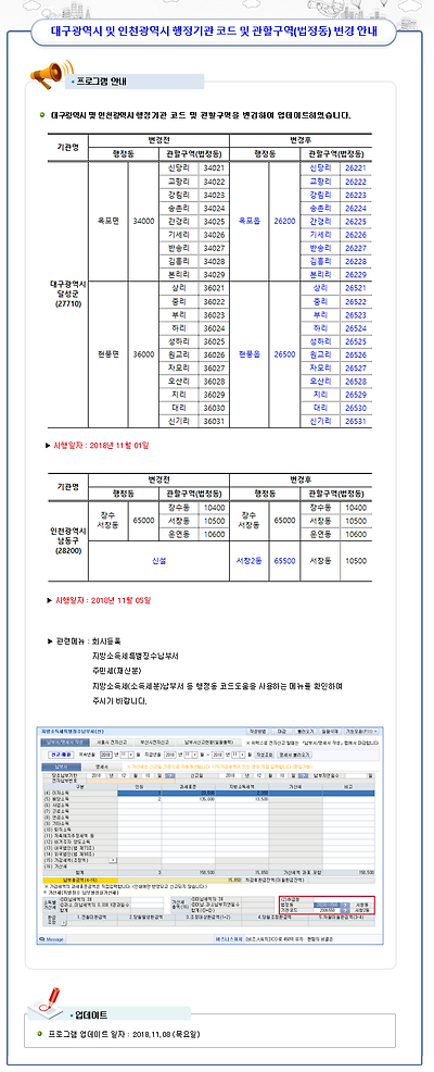 대구광역시 및 인천광역시 행정기관 코드 및 관할구역(법정동) 변경 안내 작성자Jayden Ju.|작성시간18.11.09|조회수69 목록 댓글 0 글자크기 작게가 글자크기 크게가 다음검색 현재 게시글 추가 기능 열기 북마크 공유하기 신고 센터로 신고 댓글 댓글 0 댓글쓰기 답글쓰기 댓글 리스트