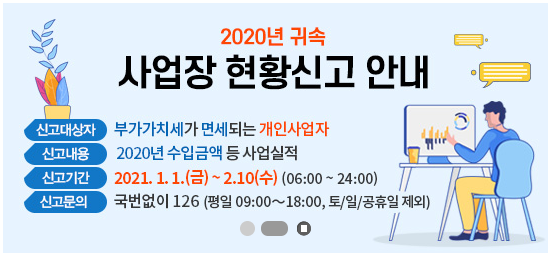 부가가치세가 면세되는 개인사업자는 직전년도 연간 수입금액 및 사업장현황을 사업장 관할세무서에 신고하여야 합니다.