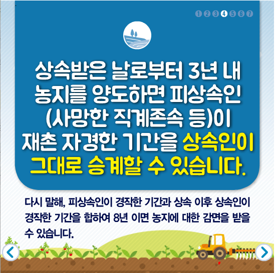 상속받은 농지를 양도하는 경우에는 8년 자경농지의 경작기간을 계산할 때, 피상속인이 8년이상 경작한 사실(재촌,자경)이 있는 경우에는 상속개시일(사망일) 이후 상속인이 경작하지 아니하더라도 상속개시일로부터 3년 이내에 양도하면 8년이상 자경한 것으로 보아 양도소득세의 감면을 적용하고,