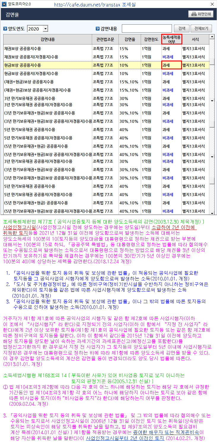 조세특례제한법 제77조 [ 공익사업용토지 등에 대한 양도소득세의 감면(2003.12.30 제목개정) ] 사업인정고시일 - 소급하여 2년 이전에 취득한 토지