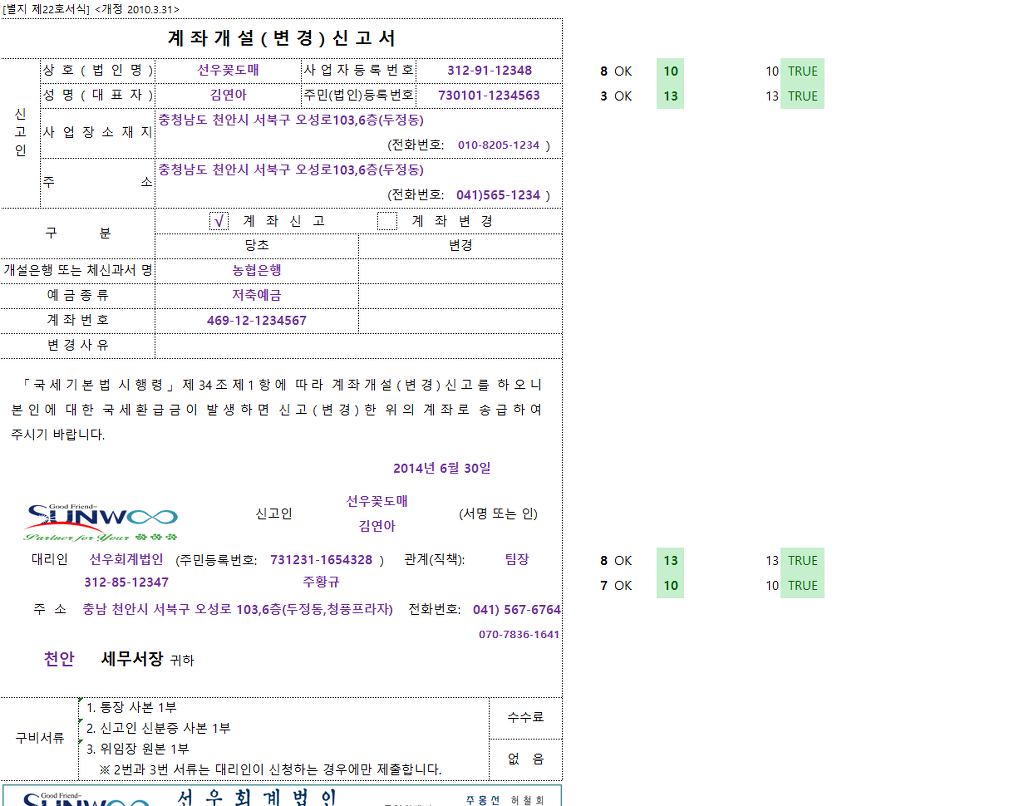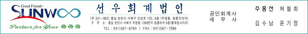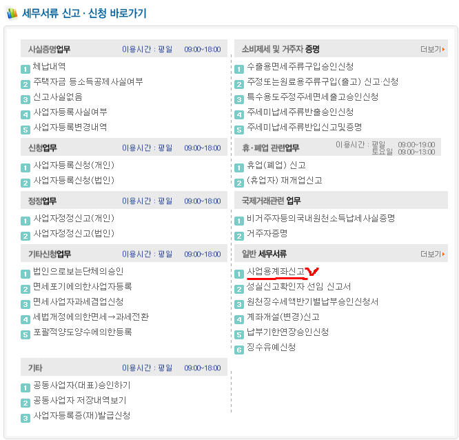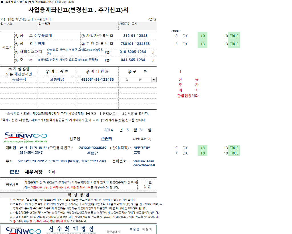 계좌개설(변경)신고서,사업용계좌신고서 2014-06-23 작성자주황규 팀장|작성시간13.12.04|조회수802 목록 댓글 0 글자크기 작게가 글자크기 크게가 사업용계좌신고&계좌개설(변경)신고-2014.06.23..xlsx 5120120424145325_사업용계좌리플릿.pdf 사업용계좌개설 신청 홈택스 (수임등록이 되어 있어야 함) 첨부파일첨부된 파일이 8개 있습니다. xlsx 파일 사업용계좌신고&계좌개설(변경)신고-2014.06.23..xlsx 다운로드 pdf 파일 5120120424145325_사업용계좌리플릿.pdf 다운로드 png 파일 계좌개설신고서.png 다운로드 png 파일 사업용계좌신고.png 다운로드 jpg 파일 선우회계법인-하단.jpg 다운로드 png 파일 세무서류신고신청.png 다운로드 png 파일 1.png 다운로드 png 파일 사업용계좌.png 다운로드 다음검색 현재 게시글 추가 기능 열기 북마크 공유하기 신고 센터로 신고 댓글 댓글 0 댓글쓰기 답글쓰기 댓글 리스트