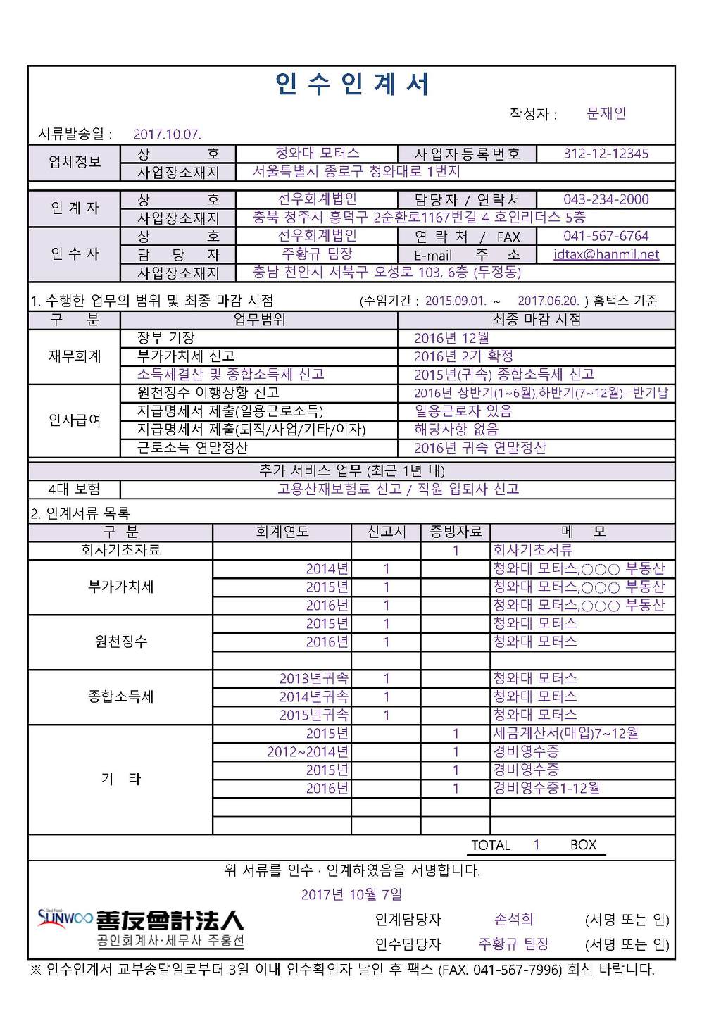 세무대리 장부인수증(인수인계증)_샘플(2018-07-08)-주황규팀장.xlsx