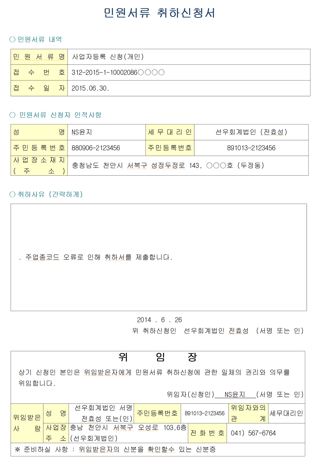 민원서류 취하신청서 취하서 세무서제출 작성자EYEDI|작성시간15.06.26|조회수7,190 목록 댓글 0 글자크기 작게가 글자크기 크게가 민원서류_취하신청서(세무서작성).hwp 민원서류_취하신청서(세무서작성).hwp 첨부파일첨부된 파일이 4개 있습니다. png 파일 취하서.png 다운로드 hwp 파일 민원서류_취하신청서(세무서작성).hwp 다운로드 jpg 파일 우림기획-선우회계법인-심볼.jpg 다운로드 hwp 파일 민원서류_취하신청서(세무서작성).hwp 다운로드 다음검색 현재 게시글 추가 기능 열기 북마크 공유하기 신고 센터로 신고 댓글 댓글 0 댓글쓰기 답글쓰기 댓글 리스트