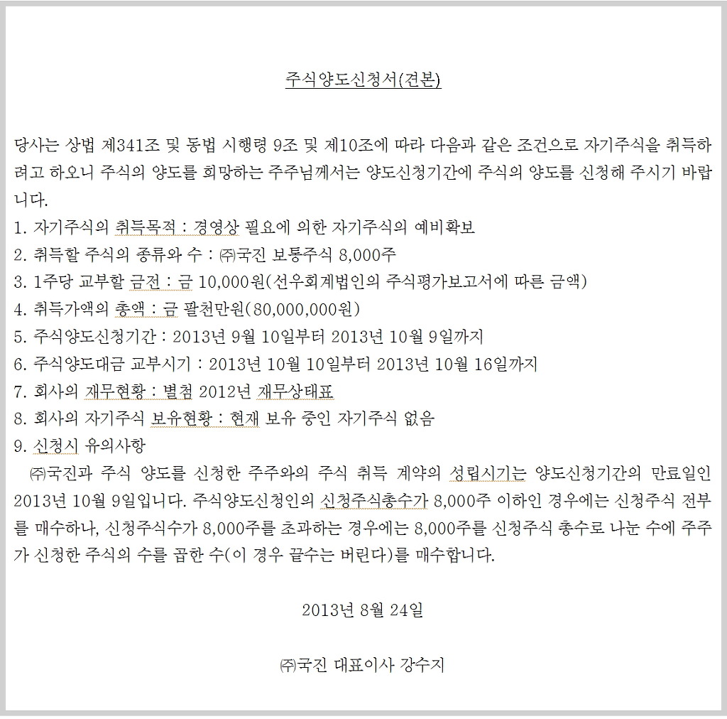 3. 자기주식취득 신청기간 | 10/5~10/26 | 상법 제341조(자기주식의 취득) 시행령 제10조 (자기주식 취득의 방법) | 신청기간 (20일이상 60일이내) |