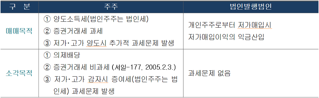 매매목적 | ① 양도소득세(법인주주는 법인세) ② 증권거래세 과세 ③ 저가・고가 양도시 추가적 과세문제 발생 | 개인주주로부터 저가매입시 저가매입이익의 익금산입 |