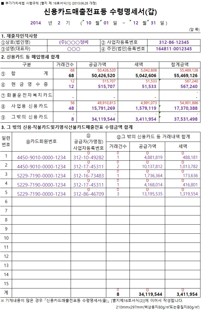 신용카드매출전표 등 수령명세서(갑) - 부가가치세법 시행령 [별지 제 16호서식(1) ] (2013. 06. 28 개정) 작성자주황규 팀장|작성시간15.11.27|조회수1,417 목록 댓글 0 글자크기 작게가 글자크기 크게가 샘플 - 신용카드매출전표등 수령명세서(갑) - 주황규.xlsx 첨부파일첨부된 파일이 2개 있습니다. xlsx 파일 샘플 - 신용카드매출전표등 수령명세서(갑) - 주황규.xlsx 다운로드 jpg 파일 신용카드매출전표등수령명세서(갑).jpg 다운로드 다음검색 현재 게시글 추가 기능 열기 북마크 공유하기 신고 센터로 신고 댓글 댓글 0 댓글쓰기 답글쓰기 댓글 리스트