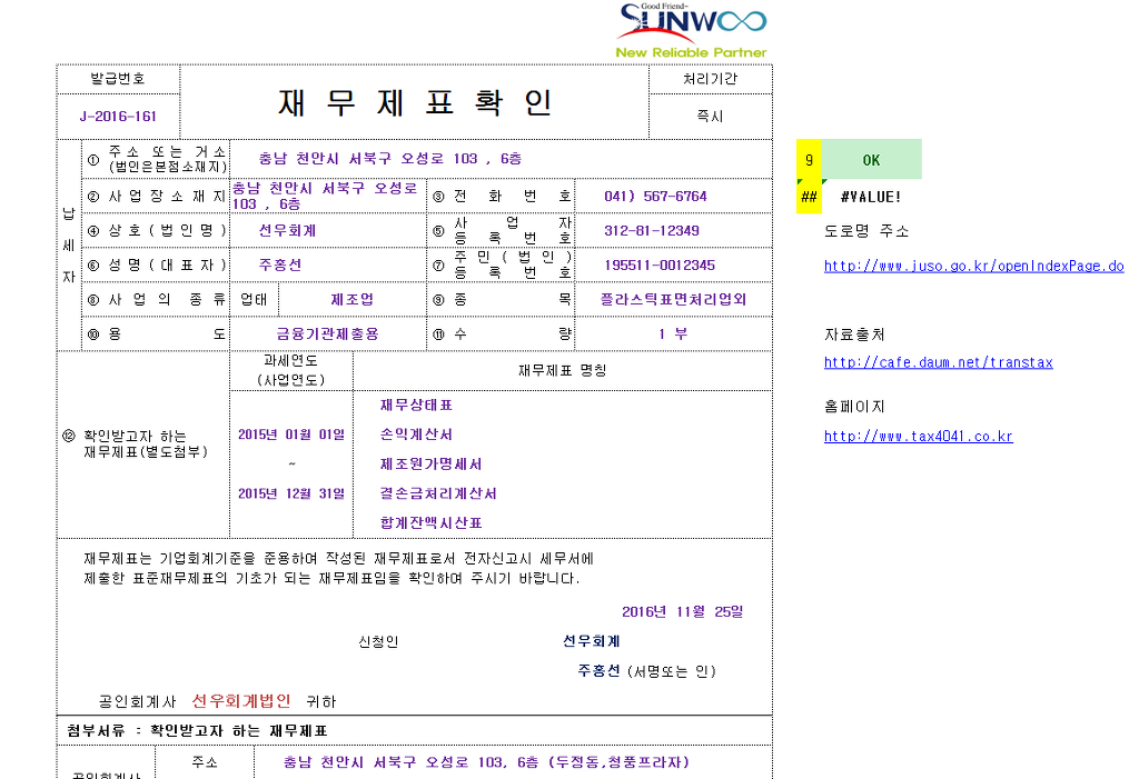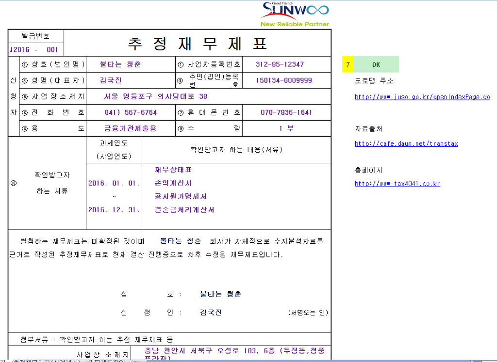 재무제표 확인 (법인세 전자신고 이후) , 추정재무제표 확인 , 회사제시 수지분석 재무제표 확인 (비영리단체등) 작성자ENOCH|작성시간16.11.25|조회수1,746 목록 댓글 0 글자크기 작게가 글자크기 크게가 추정재무제표표지 추정재무제표 표지 재무제표확인 (1).xlsx 첨부파일첨부된 파일이 4개 있습니다. png 파일 재무제표확인.png 다운로드 png 파일 추정재무제표.png 다운로드 png 파일 추정재무제표 (사업개시).png 다운로드 xlsx 파일 추정재무제표표지 추정재무제표 표지 재무제표확인 (1).xlsx 다운로드 다음검색 현재 게시글 추가 기능 열기 북마크 공유하기 신고 센터로 신고 댓글 댓글 0 댓글쓰기 답글쓰기 댓글 리스트