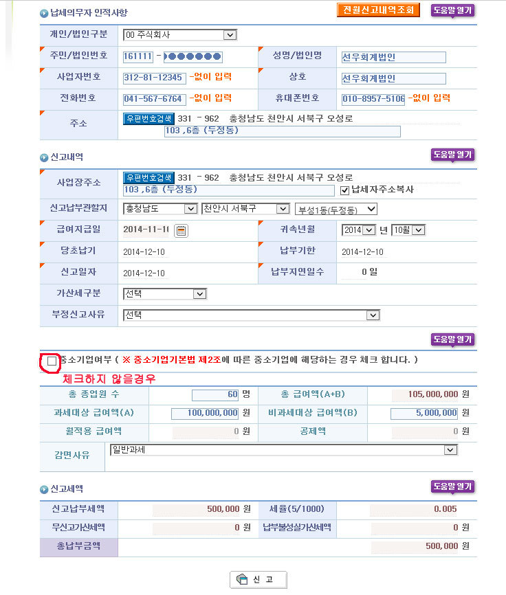 신고하고 납부하여야 합니다. - 법인 사업주는 법인명. 사업장명. 법인등록번호를, 개인 사업주는 성명, 주민등록번호, 상호, 기타 내용은 법인사업주나 개인사업주가 동일하게 기재하시기 바랍니다.
