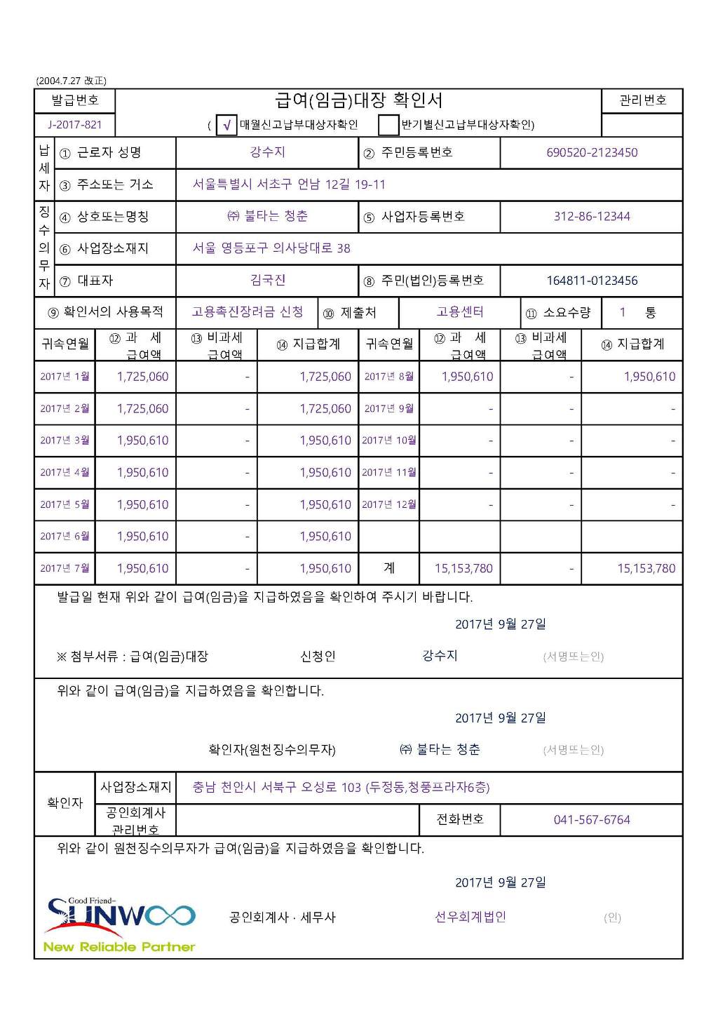 급여대장 확인서 , 임금대장 확인서