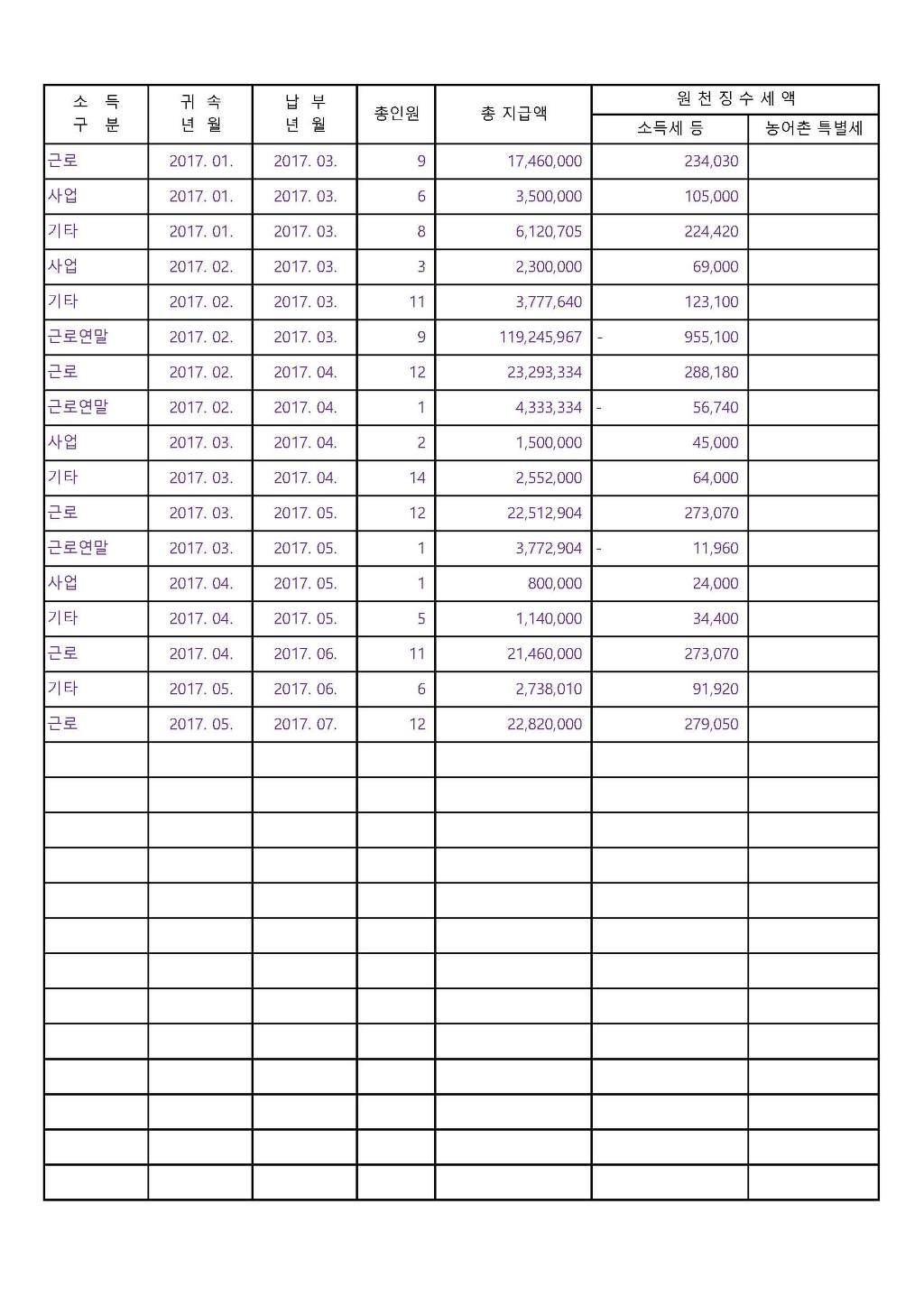 불러온 내역을 상기 내역을 엑셀로 그대로 옮긴 후 소득구분별 정렬 후 (수정신고)중복등 을 삭제