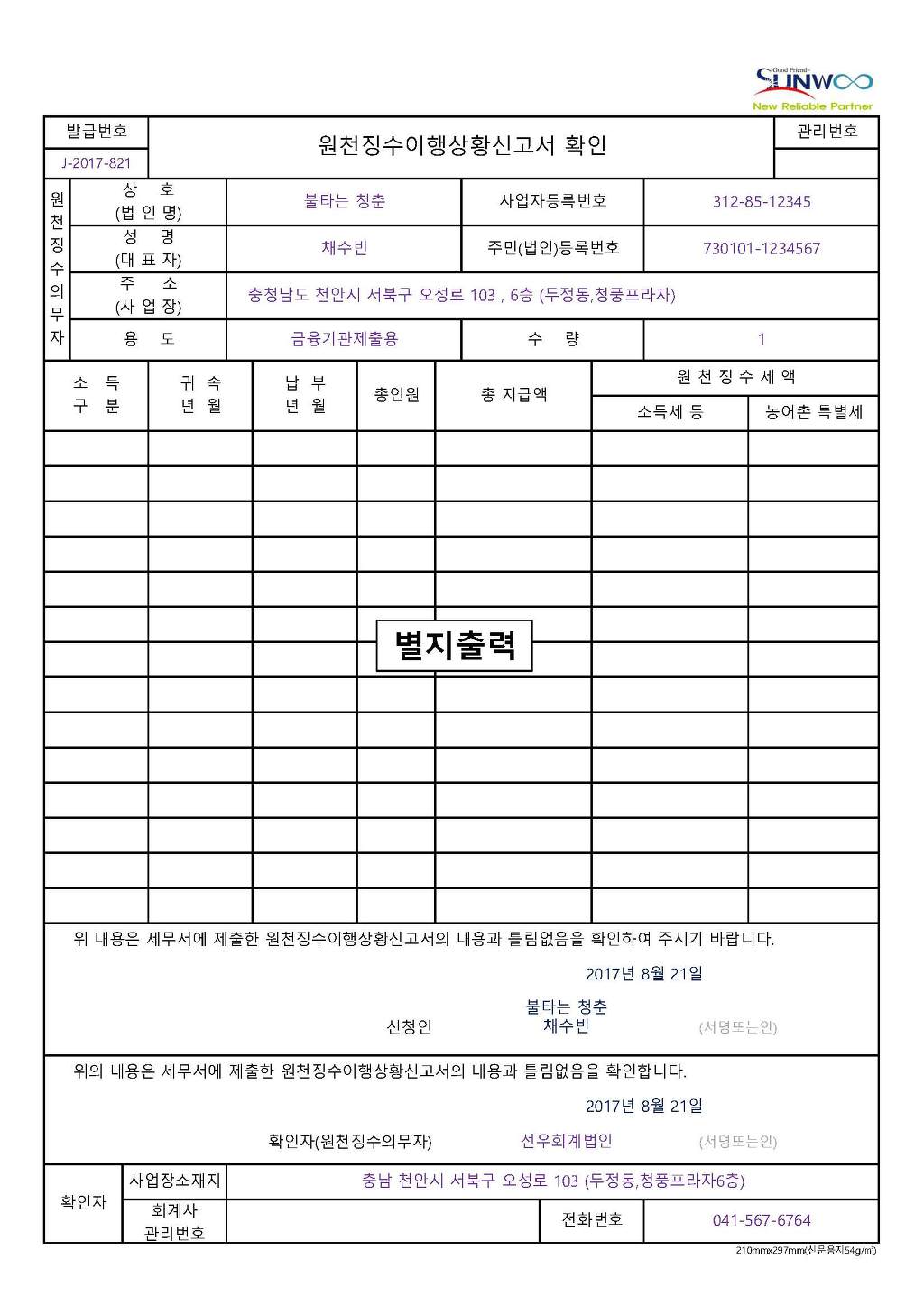 작성자One - Five작성시간17.08.21조회수3,139 목록 댓글 0원천징수이행상황신고서 확인 , 원천징수이행상황신고서확인 , 급여대장 확인서