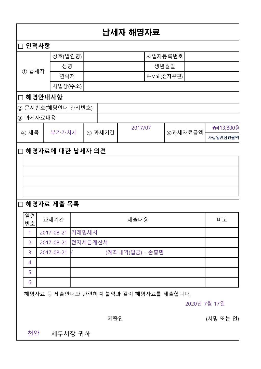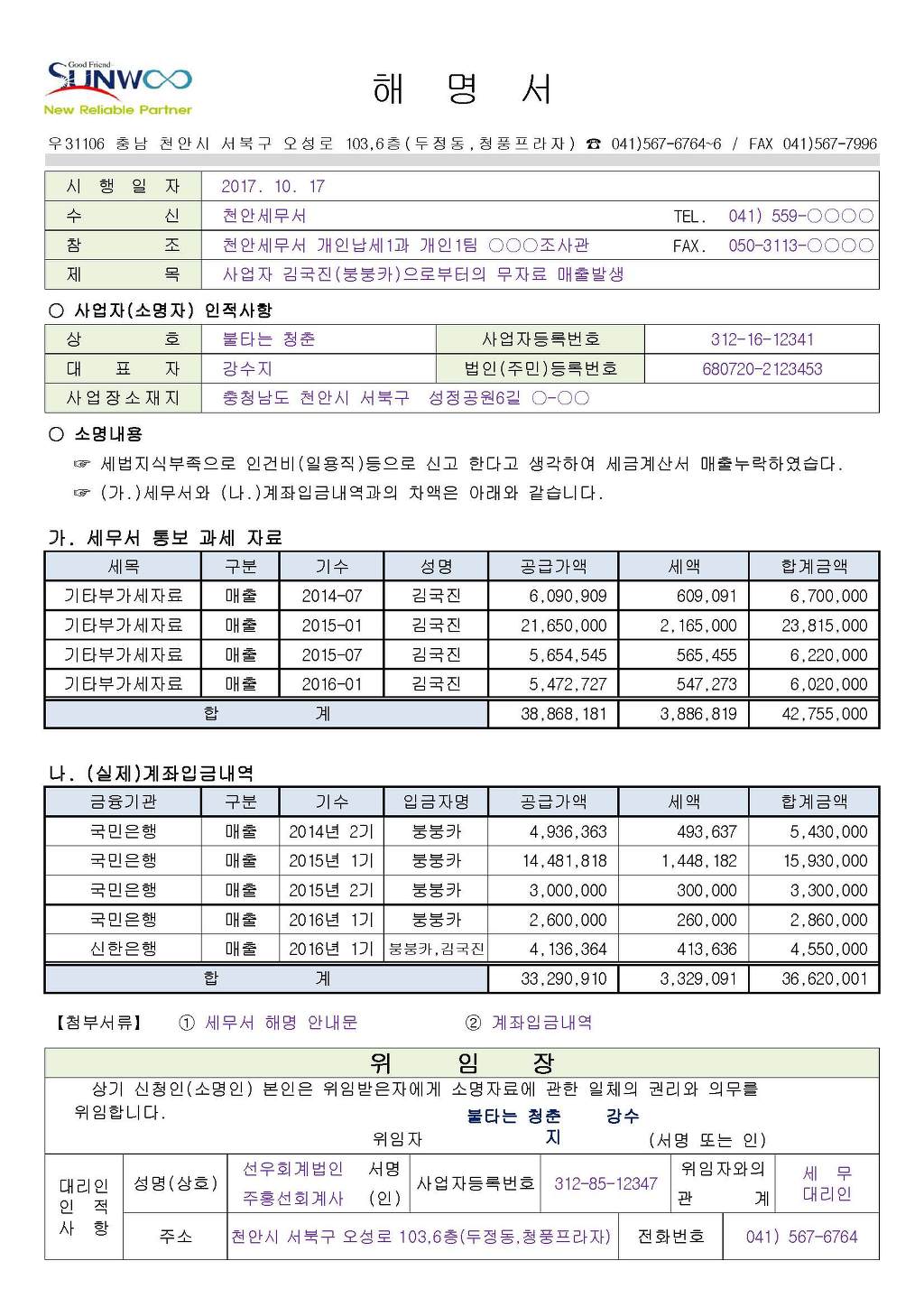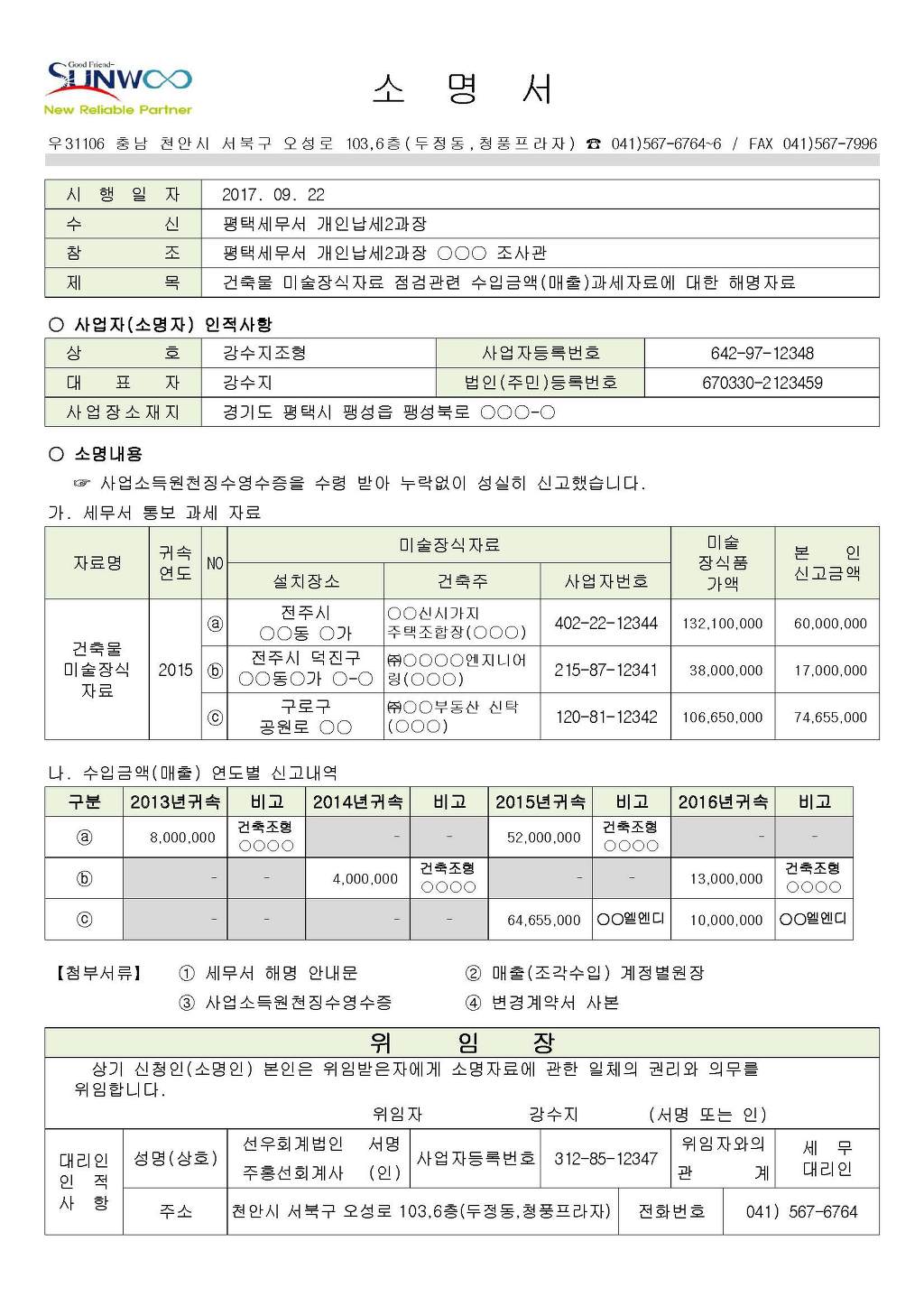 소명서 해명서 - 엑셀 2017.10.18. 작성자주황규|작성시간17.09.22|조회수4,486 목록 댓글 0 글자크기 작게가 글자크기 크게가 납세자해명자료(세무서서식).xlsx 소명서 해명서 2017-10-18.xlsx 소명서 2017-09-22.xlsx 첨부파일첨부된 파일이 8개 있습니다. jpg 파일 소명서 2017-09-22.jpg 다운로드 xlsx 파일 소명서 2017-09-22.xlsx 다운로드 jpg 파일 소명서 해명서 2017-10-17.jpg 다운로드 jpg 파일 소명서 해명서 2017-10-18.jpg 다운로드 xlsx 파일 소명서 해명서 2017-10-18.xlsx 다운로드 jpg 파일 거래사실확인서.jpg 다운로드 xlsx 파일 납세자해명자료(세무서서식).xlsx 다운로드 jpg 파일 납세자해명자료(세무서서식)_Page_1.jpg 다운로드 다음검색 현재 게시글 추가 기능 열기 북마크 공유하기 신고 센터로 신고 댓글 댓글 0 댓글쓰기 답글쓰기 댓글 리스트
