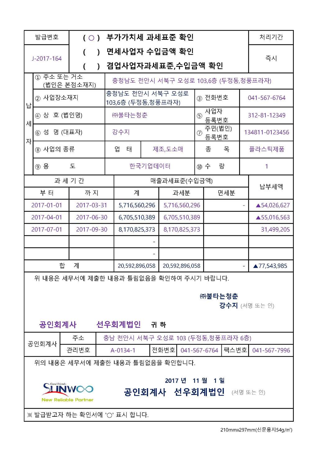 부가가치세 과세표준 확인 , 면세사업자 수입금액 확인 , 겸업사업자 과세표준, 수입금액 확인 작성자EYEDI|작성시간17.10.17|조회수2,052 목록 댓글 0 글자크기 작게가 글자크기 크게가 부가가치세과세표준증명원 - 홈택스에서 출력 부가가치세과세표준확인 - 2017-11-01.xlsx부가가치세 과세표준 확인면세사업자 수입금액 확인겸업사업자과세표준 , 수입금액 확인 첨부파일첨부된 파일이 4개 있습니다. jpg 파일 부가가치세과세표준확인 - 2017-11-01.jpg 다운로드 xlsx 파일 부가가치세과세표준확인 - 2017-11-01.xlsx 다운로드 jpg 파일 세무사.jpg 다운로드 jpg 파일 선우회계법인.jpg 다운로드 다음검색 현재 게시글 추가 기능 열기 북마크 공유하기 신고 센터로 신고 댓글 댓글 0 댓글쓰기 답글쓰기 댓글 리스트