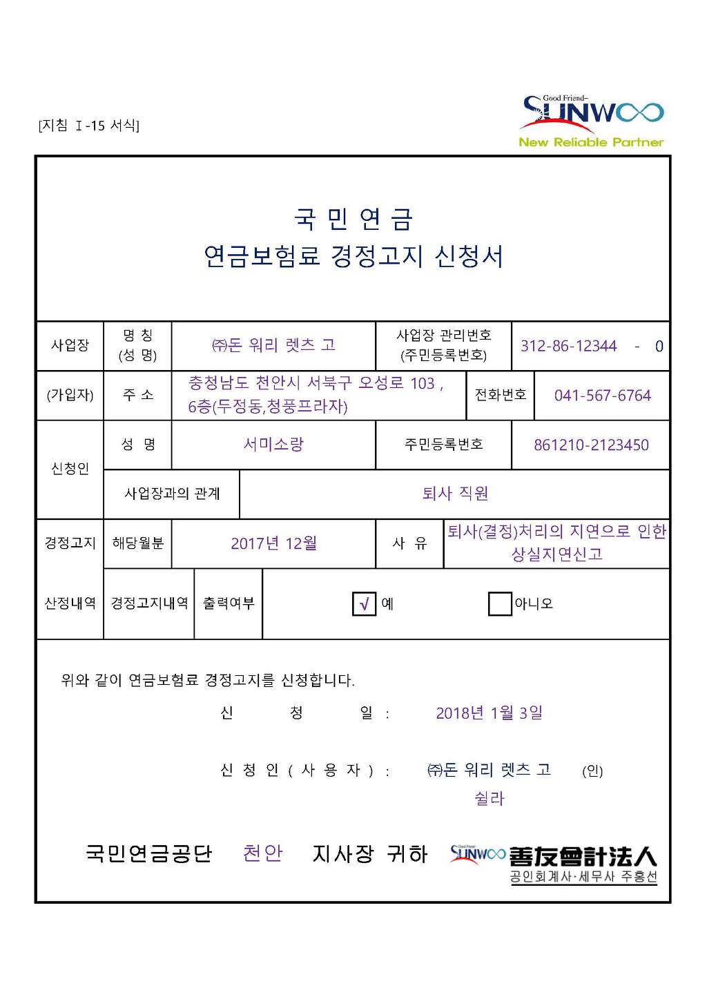 국민연금 연금보험료 경정고지 신청서 작성자EYEDI|작성시간18.01.03|조회수2,633 목록 댓글 0 글자크기 작게가 글자크기 크게가 국민연금 연금보험료 경정고지 신청서 (조세실).xlsx 첨부파일첨부된 파일이 7개 있습니다. jpg 파일 국민연금 연금보험료 경정고지 신청서_1.jpg 다운로드 jpg 파일 뉴약도.jpg 다운로드 jpg 파일 선우회계법인 주황규.jpg 다운로드 jpg 파일 국민연금 연금보험료 경정고지 신청서.jpg 다운로드 xlsx 파일 국민연금 연금보험료 경정고지 신청서 (조세실).xlsx 다운로드 png 파일 서미소랑.png 다운로드 png 파일 서미소랑.png 다운로드 다음검색 현재 게시글 추가 기능 열기 북마크 공유하기 신고 센터로 신고 댓글 댓글 0 댓글쓰기 답글쓰기 댓글 리스트