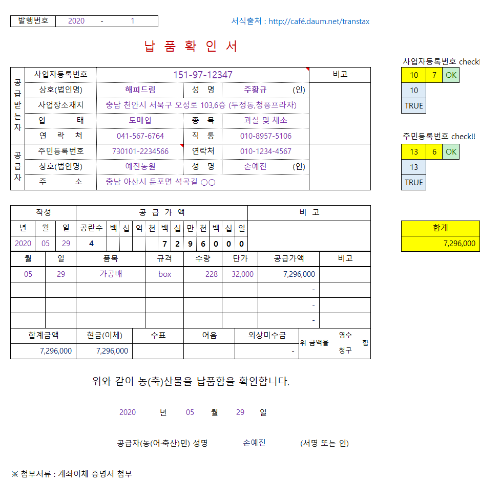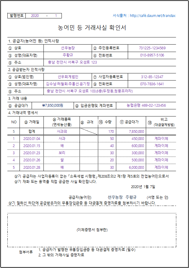 농어민거래사실확인서 - 주황규 (만든서식) (2020-02-09).xlsx