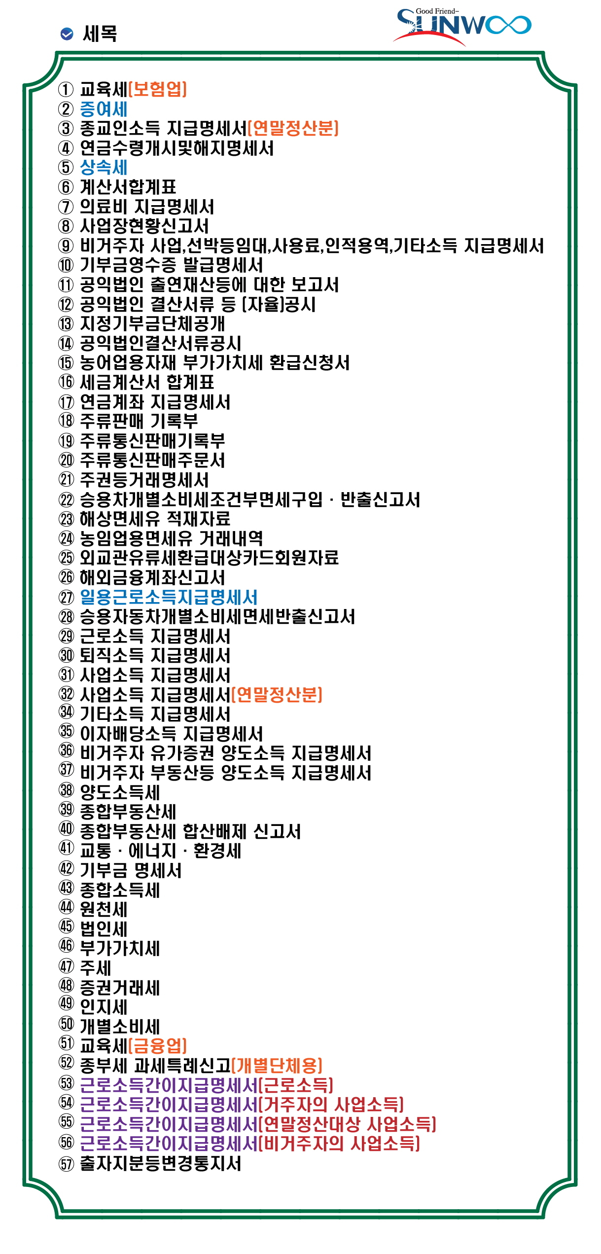 교통에너지환경세, 사업장현황신고서, 공익법인보고서, 해외금융계좌신고서, 농어업기자재환급신청서