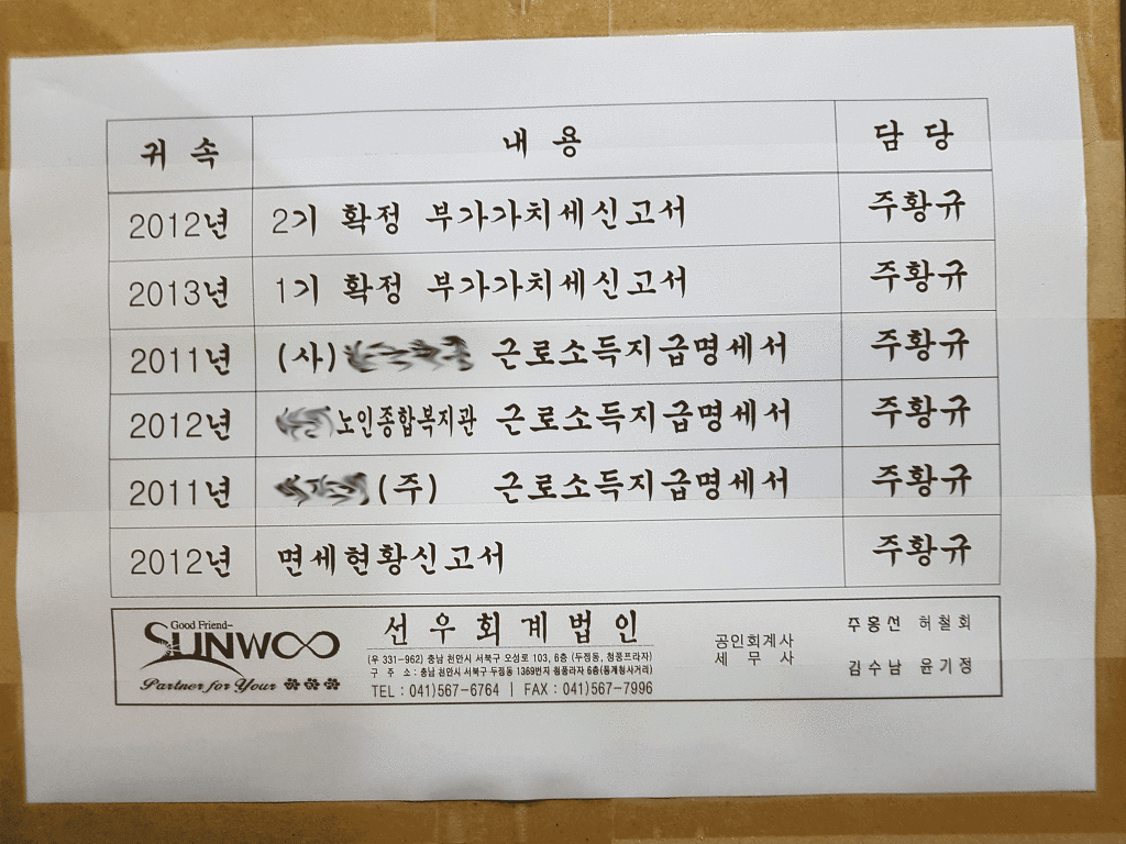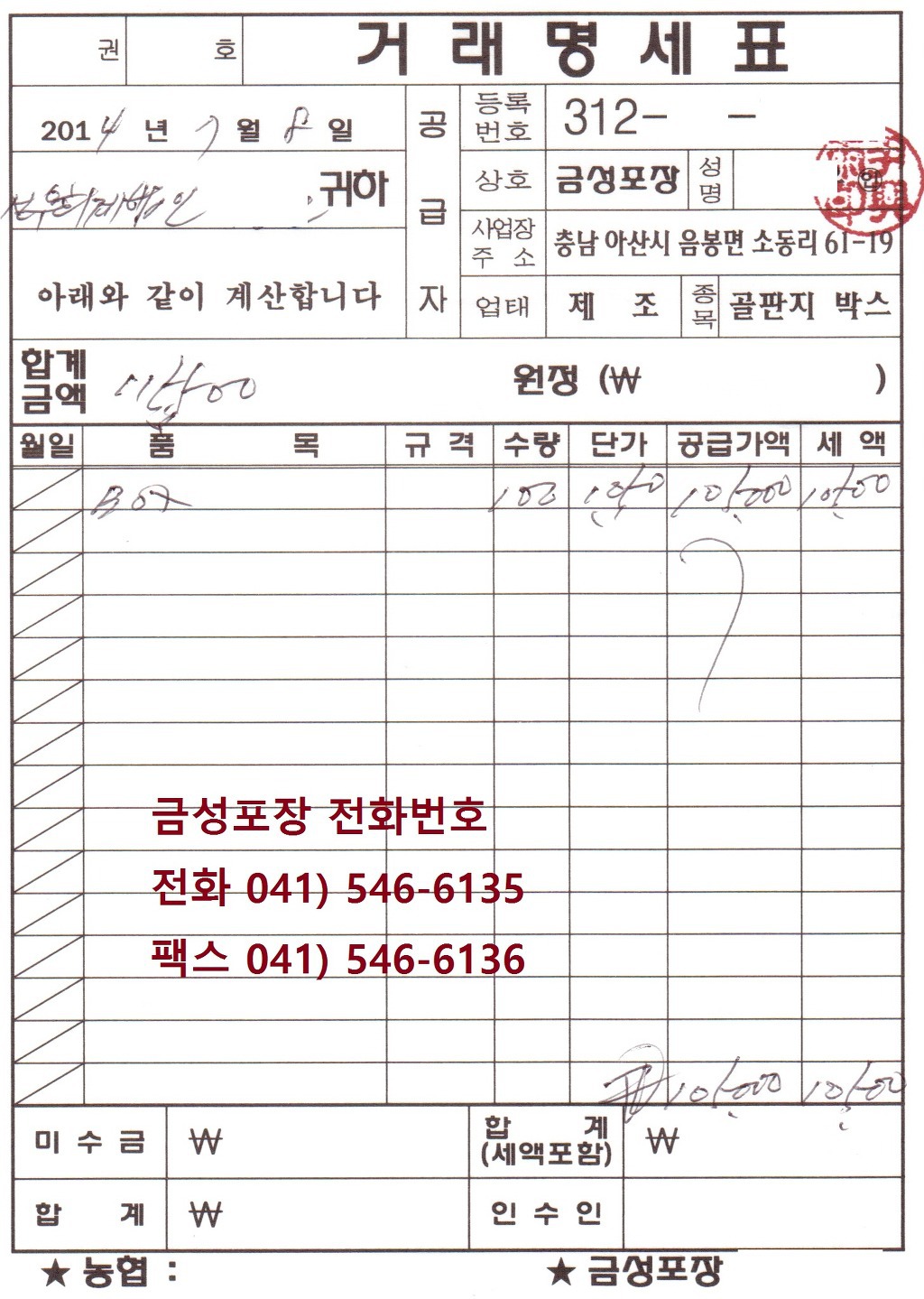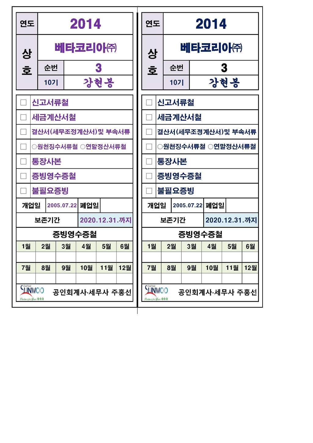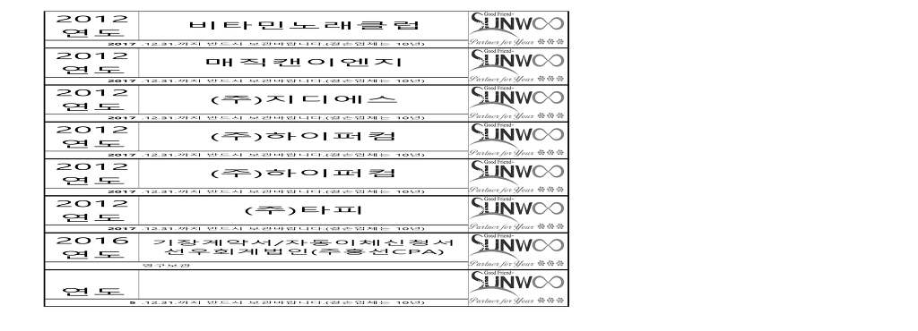 되도록이면 개업초기부터 2년간만 보관하고 업체에 반드시 돌려줄것. 보존기간 신고일로부터 5년(결손업체 10년) 이 지난 연도 자료 폐기. 폐기시 화일철등 세금계산서 자료 확인 특히 개인사업자의 임대사업자및 개인사업자의 취득,양도계약서 와 자가 건설시 세금계산서및 도급계약서등 중요서류 제외시키고 폐기시킬것. 박스 1개당 제작 1,050원 부가가치세 별도 인쇄 글 없이 금성포장 041-546-6135 팩스 041-546-6136 BA골 이중양면 골판지 골높이 : 8mm J팀 : 100개 @1,050원 105,000 10,500 K팀 : 120개 @1,050원 126,000 12,600 H팀 : 150개 @1,050원 157,500 15,750