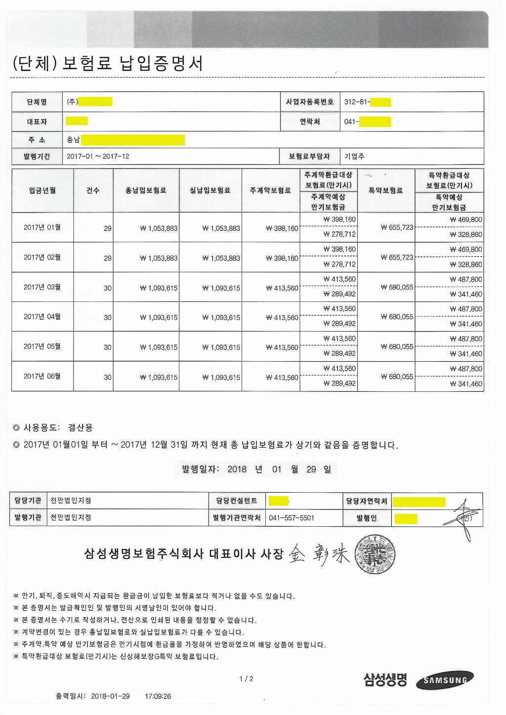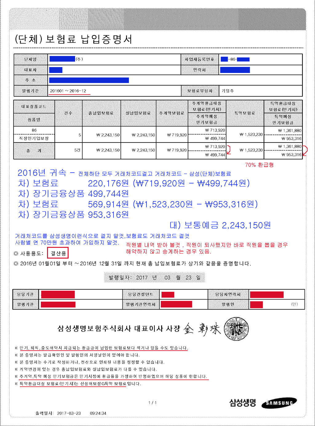 "하단 (단체)보험료 납입증명서 누적개념이 아님. 발행기간참조 201601~201612 1년단위"