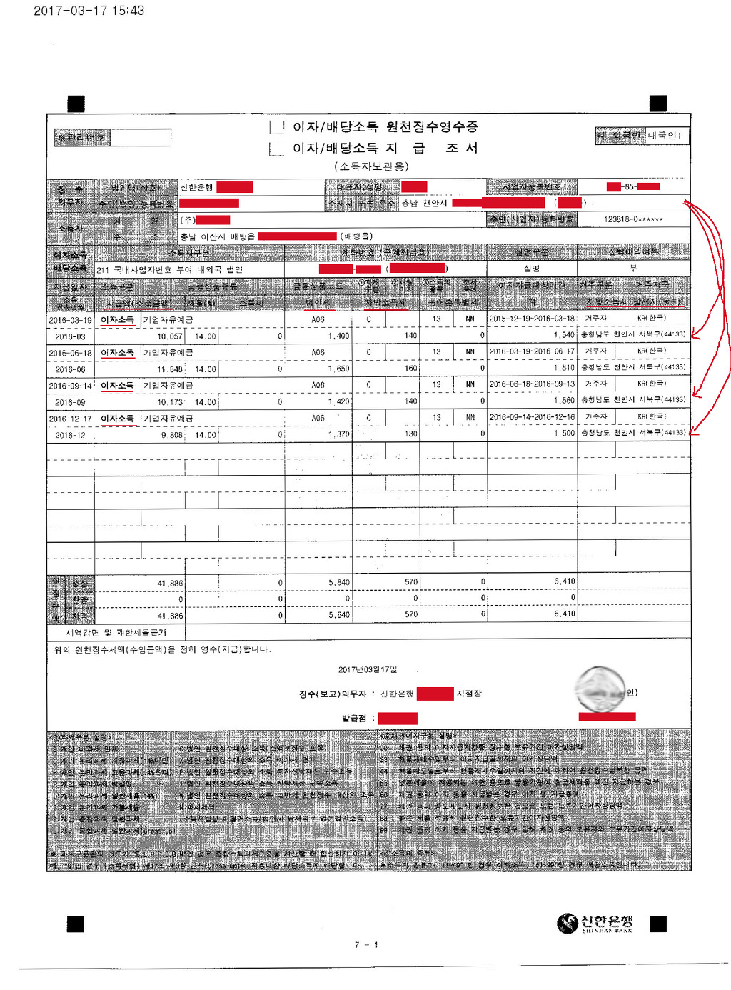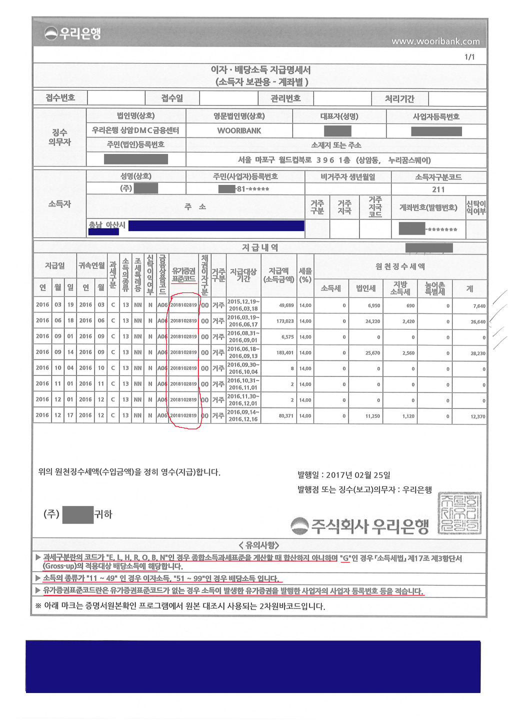 이자 배당소득 지급명세서 은행 이자수익 , 원천납부세액명세서 ==> 은행 원천징수의무자 주소 "동"까지 알아야 합니다.