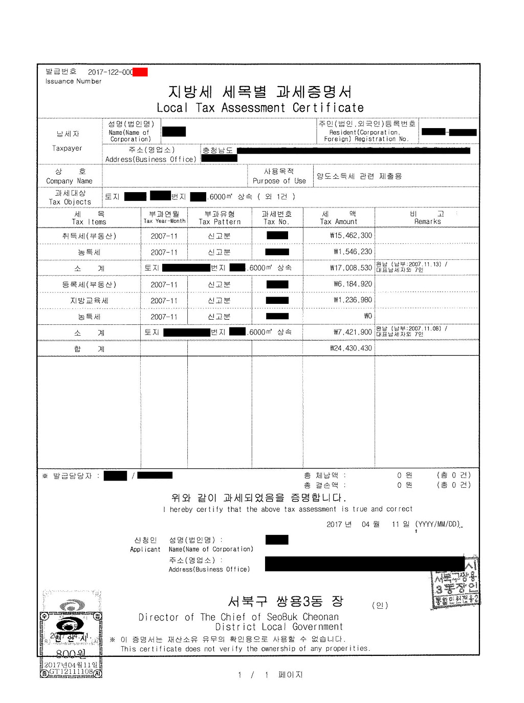 지방세 세목별 과세증명서 ( Local Tax Assessment Certificate ) 작성자EYEDI|작성시간17.04.17|조회수1,191 목록 댓글 0 글자크기 작게가 글자크기 크게가 다음검색 현재 게시글 추가 기능 열기 북마크 공유하기 신고 센터로 신고 댓글 댓글 0 댓글쓰기 답글쓰기 댓글 리스트