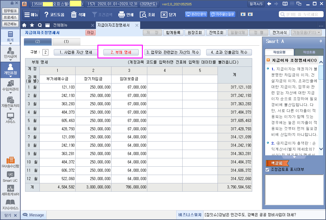 2. 장기차입금 -> 비유동성장기부채 (1년이내 도래 상환일 확인) 계정대체