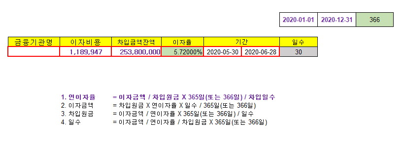 4. 일 수 = 이자금액 / 연이자율 / 차입원금 * 365일(또는 366일)