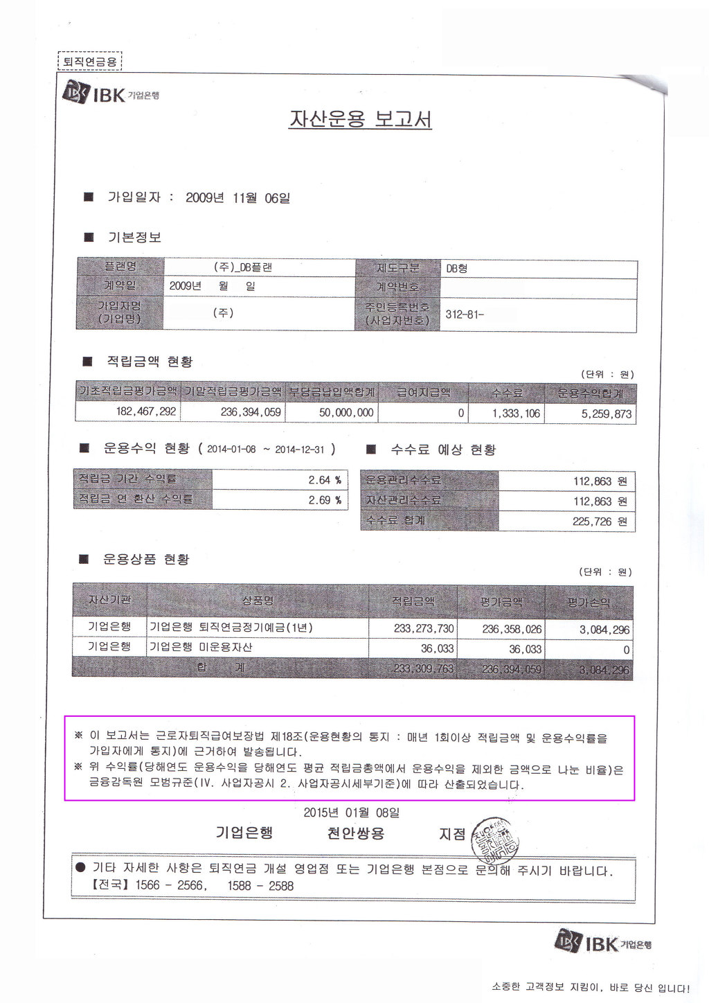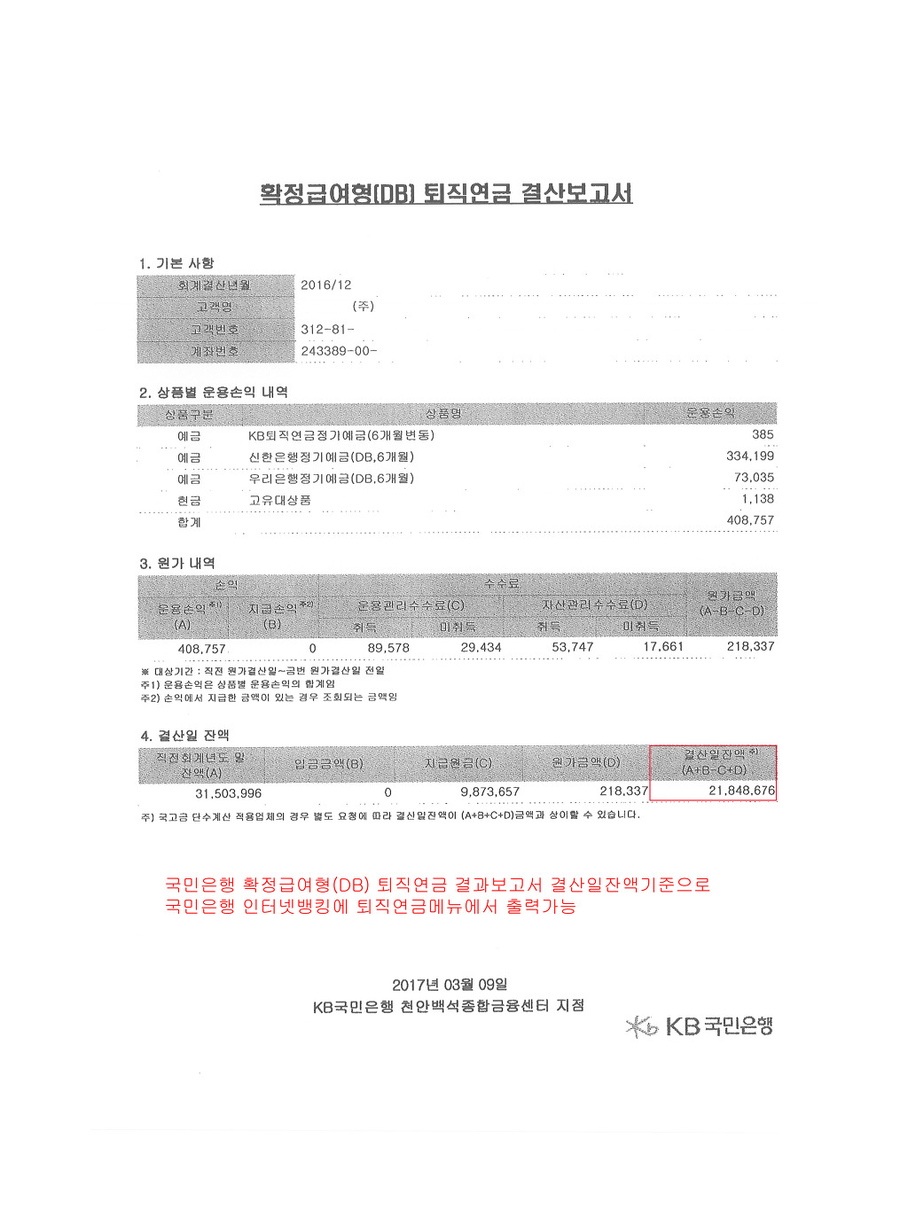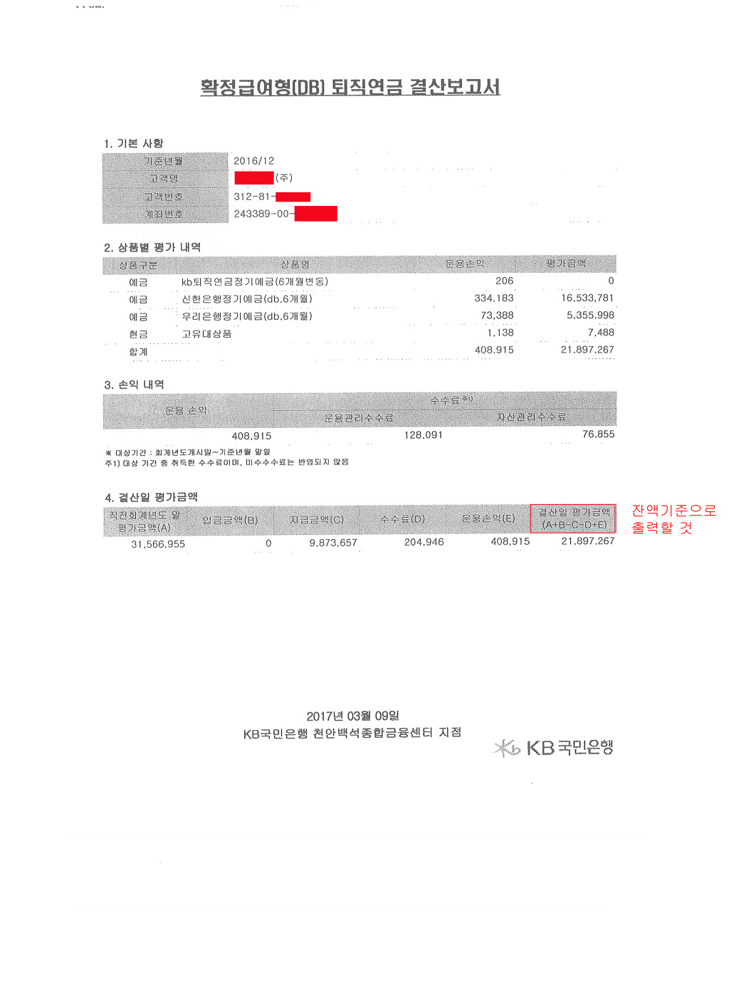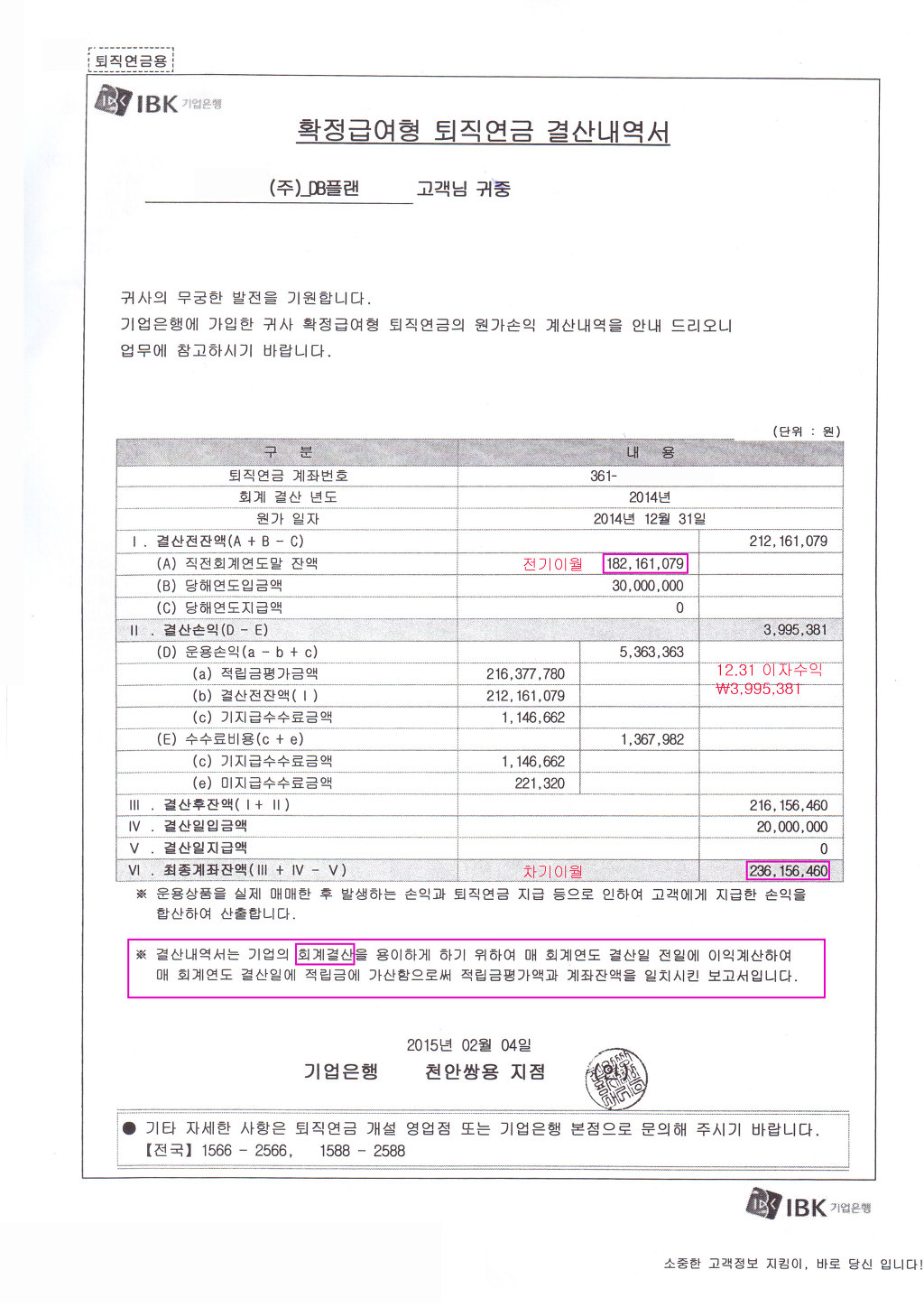상품운용신청서 [DC/IRP] IBK기업은행 확정급여형 퇴직연금 결산내역서 (분개용) / 자산운용 보고서 (퇴충조정)