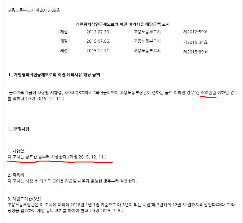 「근로자퇴직급여보장법」 '15년 개정 고시 모음 IRP이전 예외 2015.12.11.이후 퇴직자 -> 150만원이하 => 300만원이하
