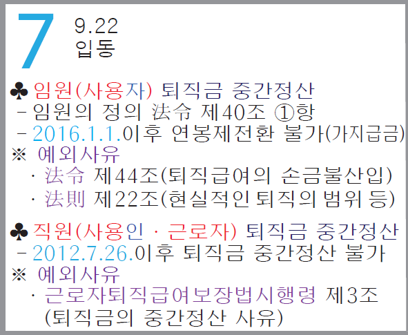 1. 「근로자퇴직급여 보장법 시행령」제3조(퇴직금의 중간정산 사유) 제1항 각 호의 어느 하나에 해당하는 경우