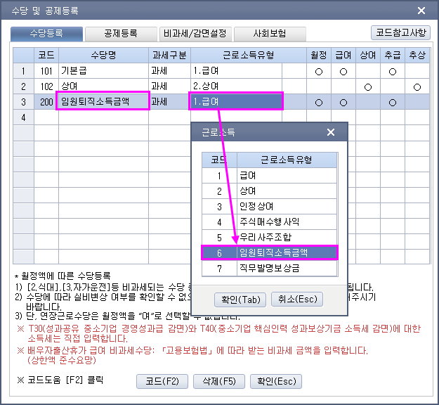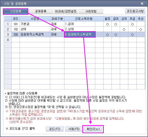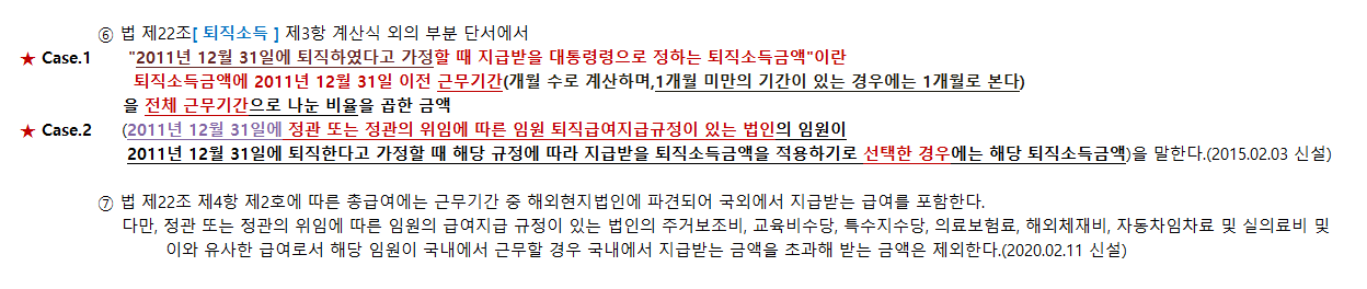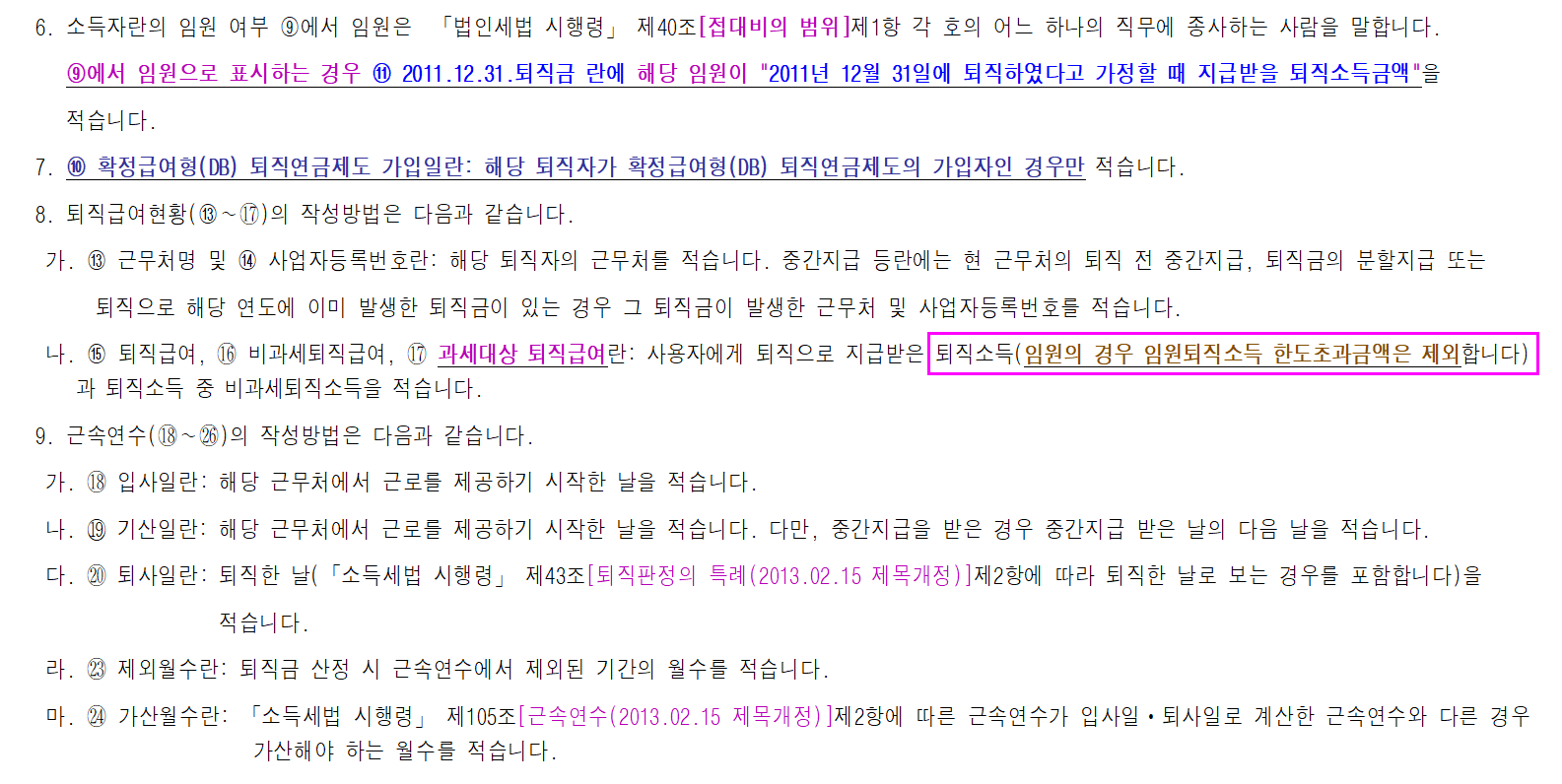 하단 임원퇴직소득 한도초과액 (<-세법규정 임원 퇴직소득( 2011년 12월 31일까지 회사퇴직금지급규정 한도없이 세법도 인정-> 2012.1.1.~2019.12.31.까지 3배수 세법 인정 -> 2020.1.1.이후 2배수 세법 인정) 한도 초과액) -> 세법인정 퇴직소득 한도 초과액은 근로소득과세하므로 퇴사월의 급여대장에 기재