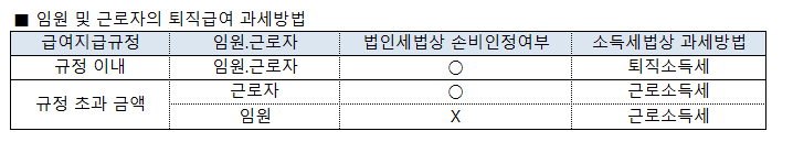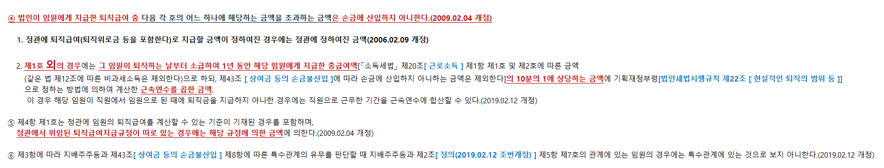 다만, 중요한 한 가지는 정관 또는 정관에서 위임한 퇴직금지급규정(주주총회의사록)에 의해 계산된 금액보다 더 많은 퇴직금을 지급한 경우 모든 금액이 손금불산입 되는 것이 아니라 규정을 초과하여 지급된 금액에 대해서만 손금불산입 됩니다.