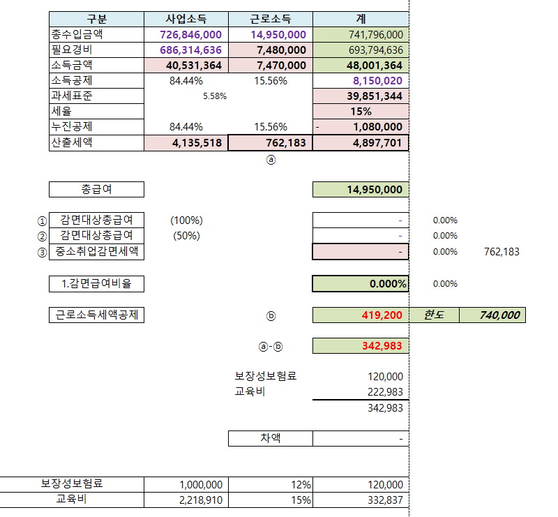 | 답변 | 특별세액공제(보험료, 의료비, 교육비)는 근로소득이 있는 경우에 적용되므로 종합소득산출세액 중에서 근로소득이 차지하는 산출세액 범위 내에서만 공제가 가능합니다. [종합소득세신고서] > 종합소득세액계산 탭 > 세액공제입력 - '세액공제한도액 검증' 버튼에서 검증 누르시어, 공제가능금액만큼 편집해주시기 바랍니다. |