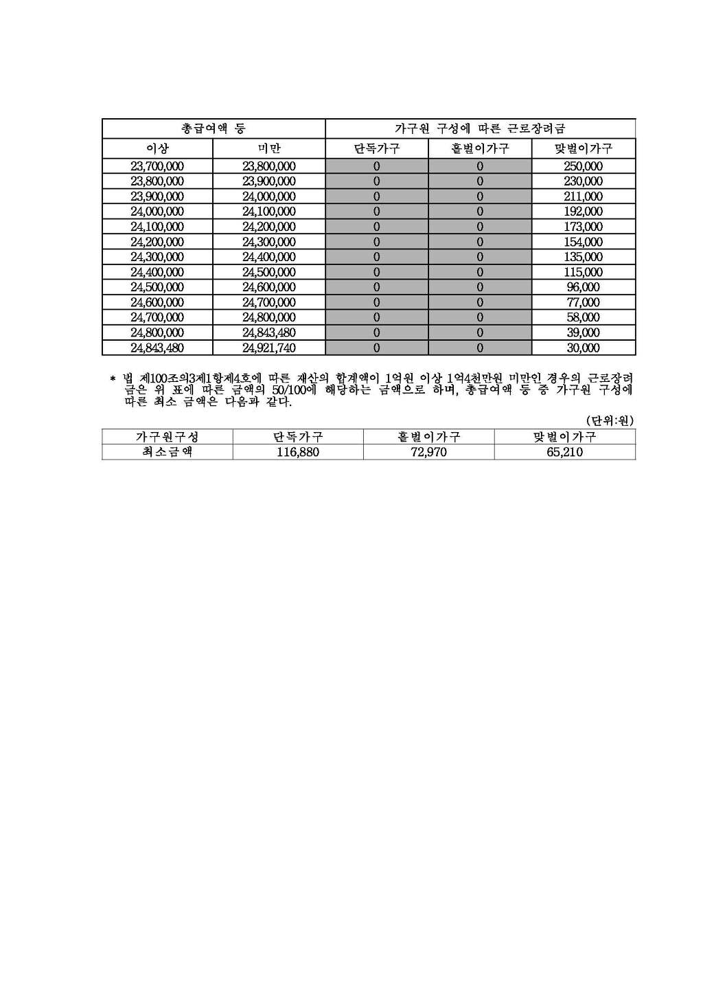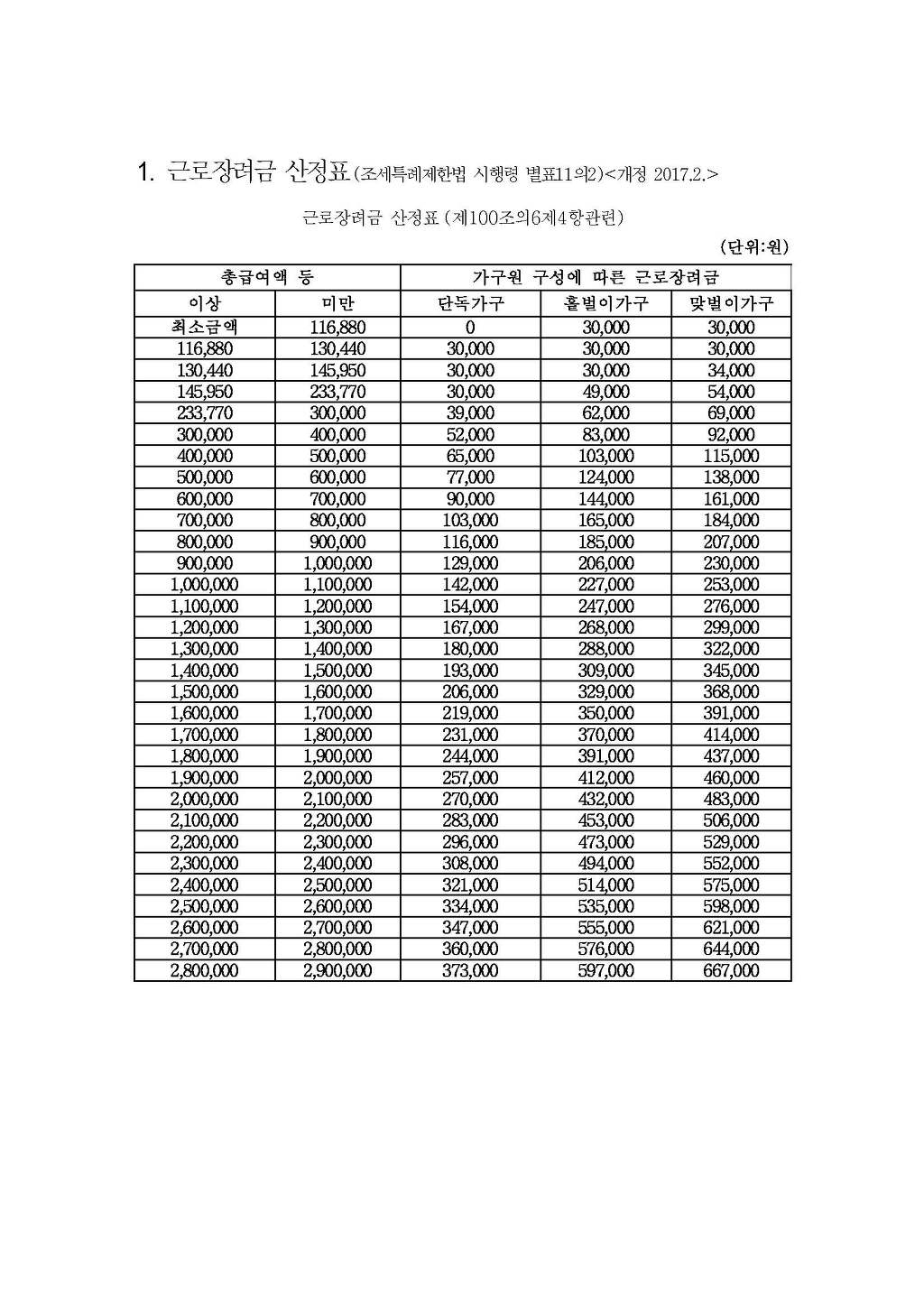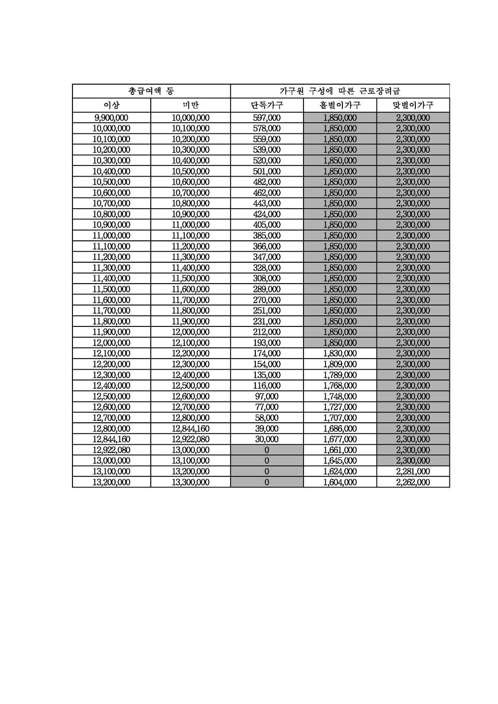 위 산식은 계산편의를 위한 것이며 정확한 금액은 근로장려금 산정표에 따라 지급하므로 다소 차이가 있을 수 있습니다.