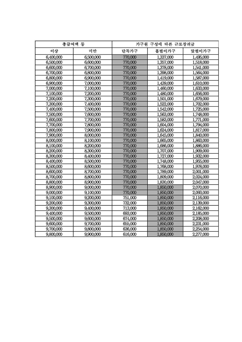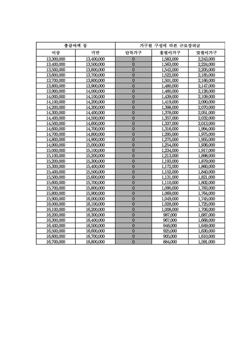 가구원 구성에 따른 총 급여액 등 및 근로장려금 지급액
