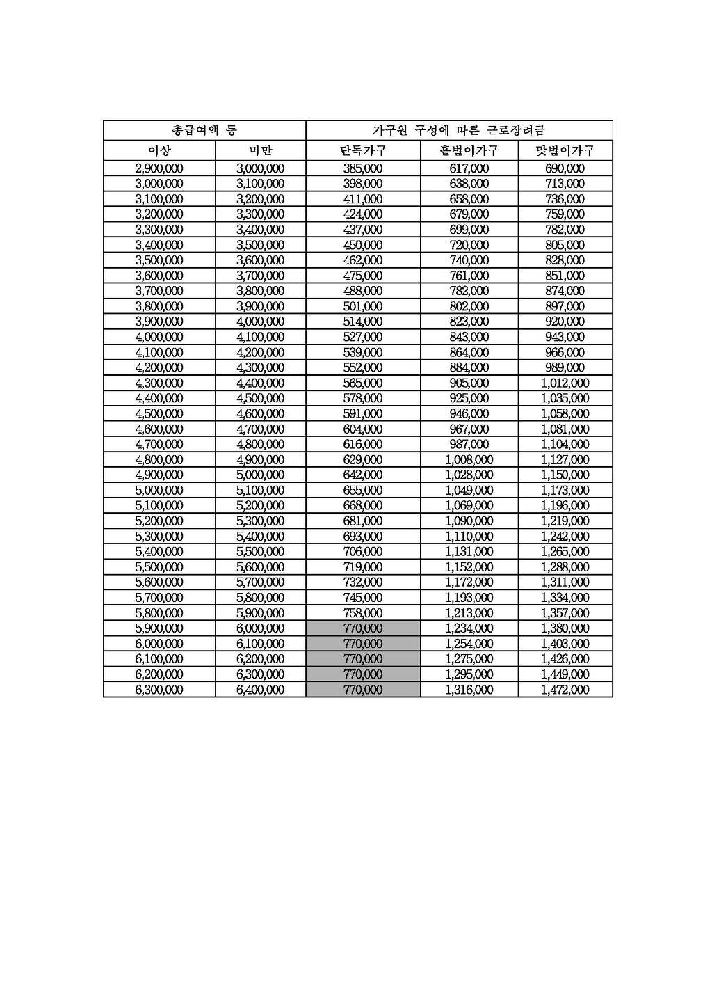 - 맞벌이 가구 : 전년도 연간 거주자의 배우자가 총급여액 등이 3백만원 이상인 가구