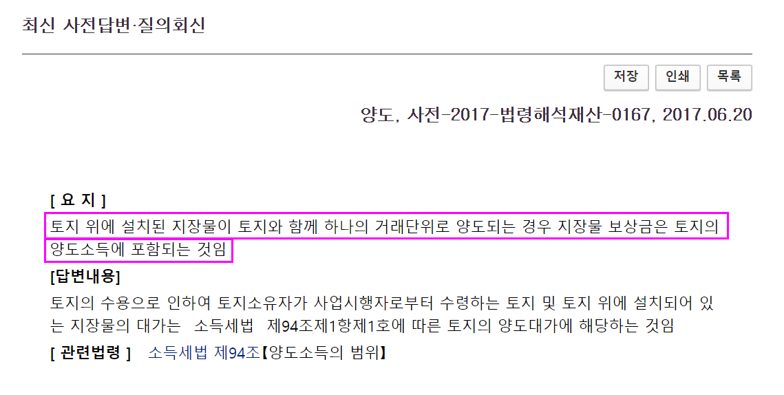 - 지작물의 손실보상금 : 과수, 입목, 경작물 등을 토지 등과 별도로 구분하여 보상받은 경우 당해 보상금의 소득세법상 소득구분