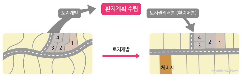 환지방식으로 도시개발사업 시행 시 토지 면적의 규모를 조정할 특별한 필요가 있는 경우에는 면적이 작은 토지는 과소필지가 되지 않도록 면적을 늘려 환지를 정하거나 환지 대상에서 제외할 수 있고, 면적이 넓은 토지는 그 면적을 줄여서 환지를 정할 수도 있다.