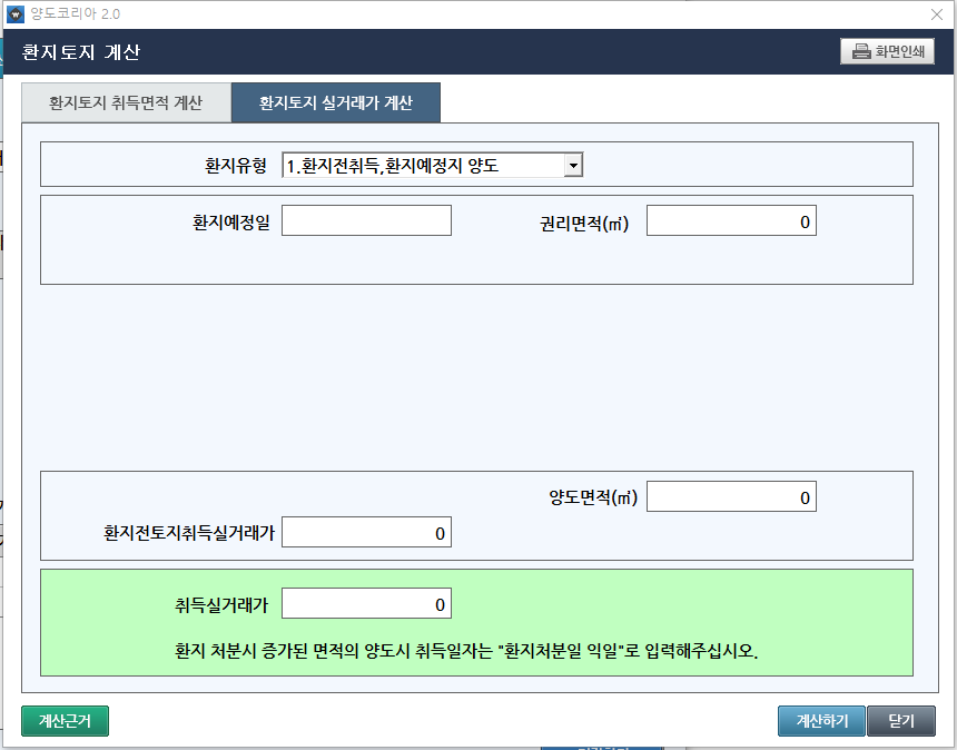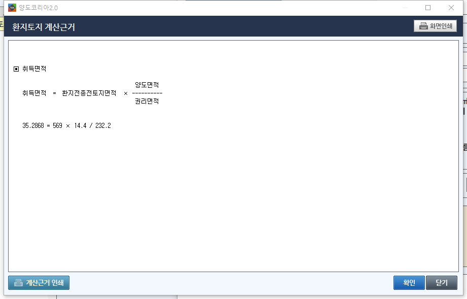 취득면적(㎡) = 환지전종전토지면적 x (양도면적/권리면적)