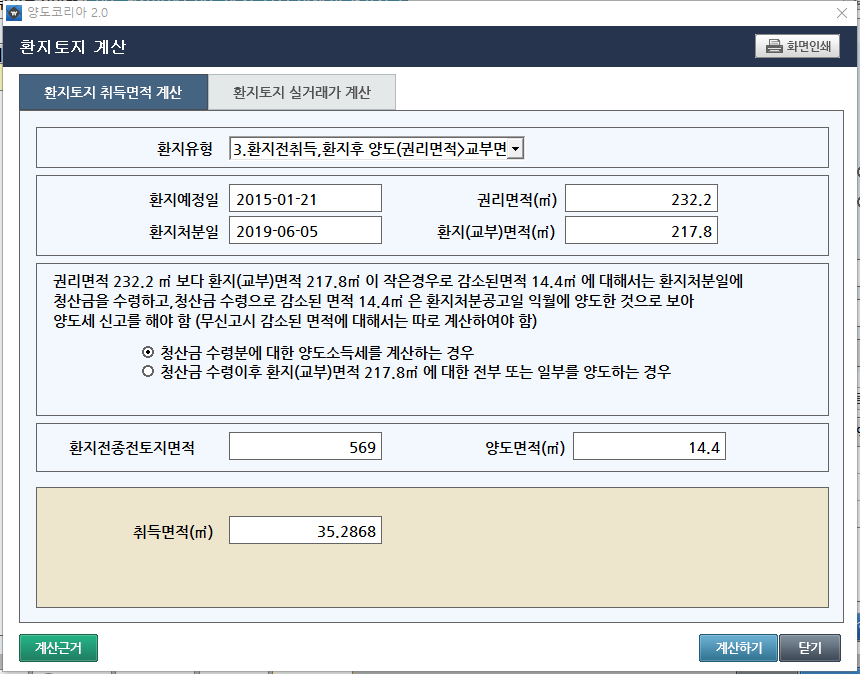 귀 상담의 경우 감소면적이 발생하여 환지청산금을 교부받는 경우 양도시기는 환지청산금 교부일과 관계없이 환지처분 공고일의 다음날이 되는 것으로 판단됩니다.