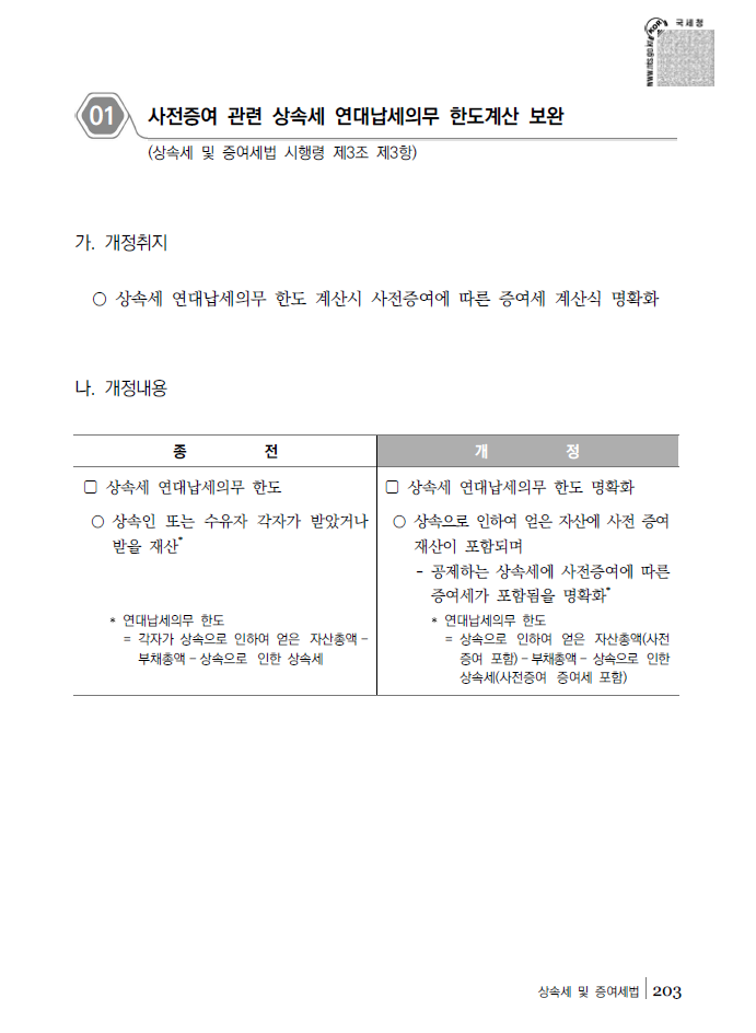사전증여 관련 상속세 연대납세의무 한도계산 보완 (상속세 및 증여세법 시행령 제3조 제3항) 작성자social distancing|작성시간20.04.11|조회수117 목록 댓글 0 글자크기 작게가 글자크기 크게가 다음검색 현재 게시글 추가 기능 열기 북마크 공유하기 신고 센터로 신고 댓글 댓글 0 댓글쓰기 답글쓰기 댓글 리스트