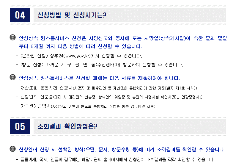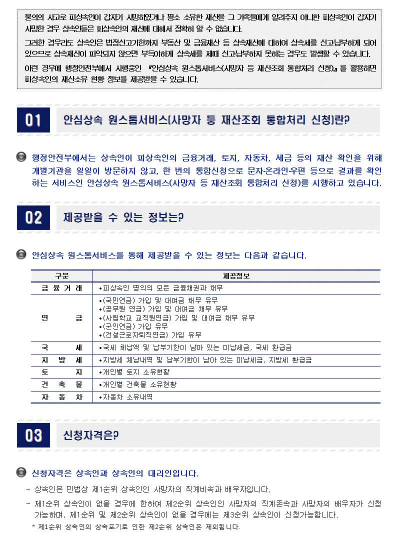 상속세 - 상속재산 확인방법 『안심상속원스톱서비스(사망자 등 재산조회 통합처리 신청)』 작성자주L황O규V팀장|작성시간20.05.12|조회수874 목록 댓글 0 글자크기 작게가 글자크기 크게가 상속재산의 확인.pdf상속재산 확인방법 안내상속재산 확인방법인 『안심상속원스톱서비스(사망자 등 재산조회 통합처리 신청)』 안내 페이지입니다.- 바로가기https://www.nts.go.kr/support/support_12.asp?cinfo_key=MINF5120100720170456&menu_a=120&menu_b=200&menu_c=5000 첨부파일첨부된 파일이 9개 있습니다. gif 파일 상속재산.gif 다운로드 gif 파일 상속세.gif 다운로드 pdf 파일 상속재산의 확인.pdf 다운로드 png 파일 상속재산.png 다운로드 png 파일 1.png 다운로드 png 파일 2.png 다운로드 png 파일 3.png 다운로드 png 파일 4.png 다운로드 png 파일 5.png 다운로드 다음검색 현재 게시글 추가 기능 열기 북마크 공유하기 신고 센터로 신고 댓글 댓글 0 댓글쓰기 답글쓰기 댓글 리스트