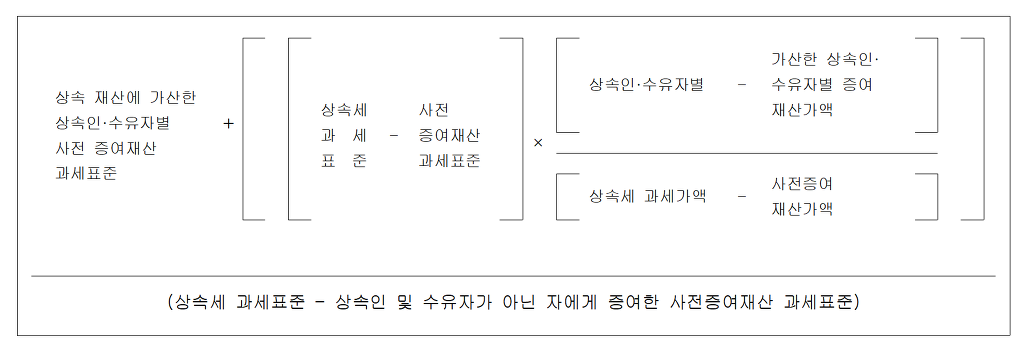 ① (상속재산에 가산한 상속인별 증여재산의 과세표준)+(㉮×㉰/㉯) ㉮ 상속세 과세표준-증여재산 과세표준 ㉯ 상속세 과세가액-가산한 증여재산가액 ㉰ 상속인별 상속세과세가액상당액-상속인별 가산한 증여재산 ② 상속세과세표준-상속인·수유자가 아닌 자에게 증여한 과세표준 |