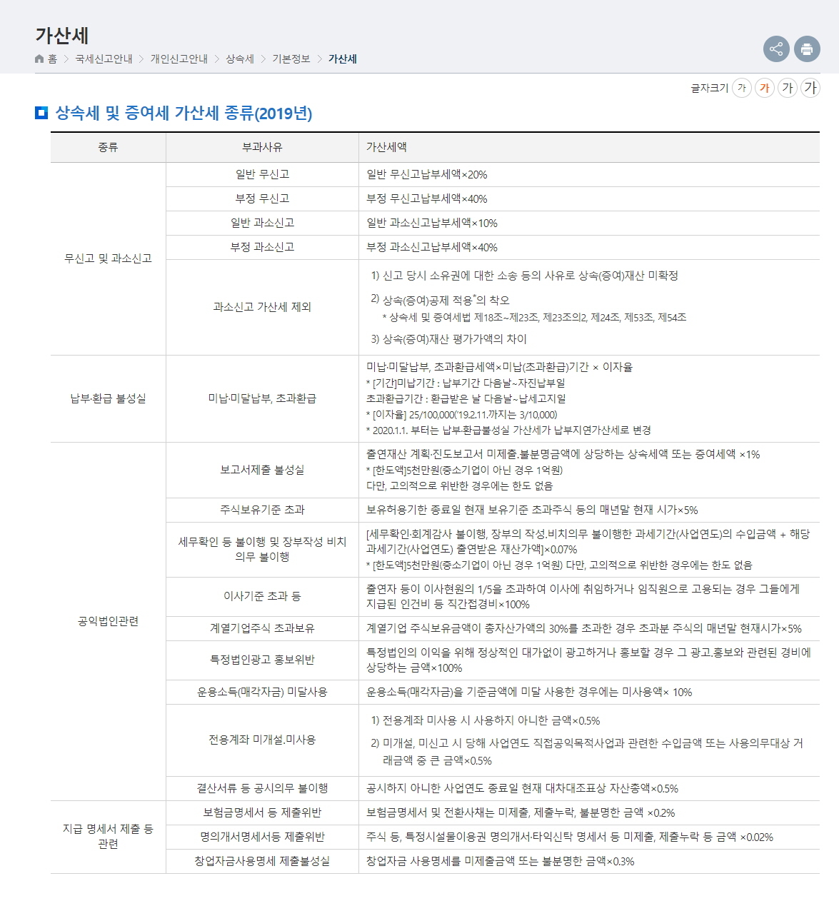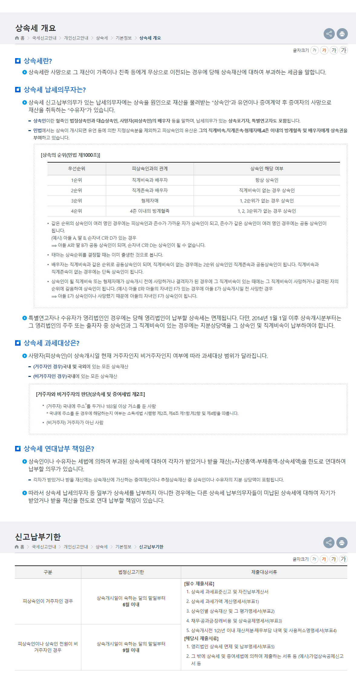 상속세 - 국세청 작성자주황규|작성시간20.12.27|조회수126 목록 댓글 0 글자크기 작게가 글자크기 크게가 https://www.nts.go.kr/nts/cm/cntnts/cntntsView.do?mi=2324&cntntsId=7718 다음검색 현재 게시글 추가 기능 열기 북마크 공유하기 신고 센터로 신고 댓글 댓글 0 댓글쓰기 답글쓰기 댓글 리스트