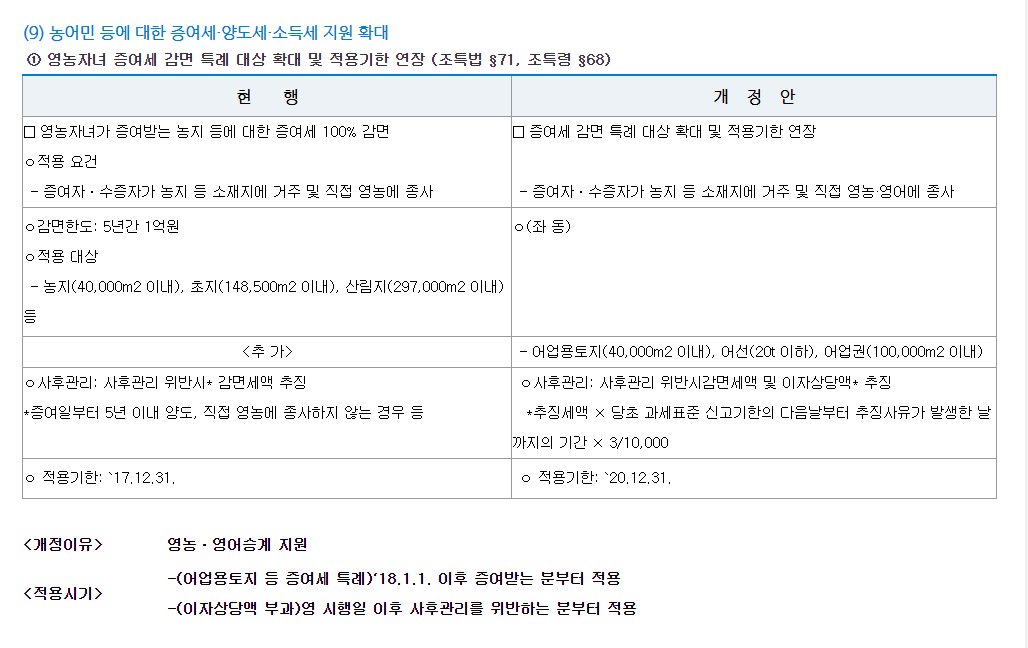 | ○ 사후관리:사후관리 위반 시* 감면세액 추징 * 증여일부터 5년 이내 양도, 직접 영농에 종사하지 않는 경우 등 ○ 적용기한:2017.12.31. | ○ 사후관리:사후관리 위반 시 감면세액 및 이자상당액* 추징 * 추징세액 × 당초 과세표준 신고기한의 다음날부터 추징사유가 발생한 날까지의 기간 × 3/10,000 ○ 적용기한:2020.12.31. |