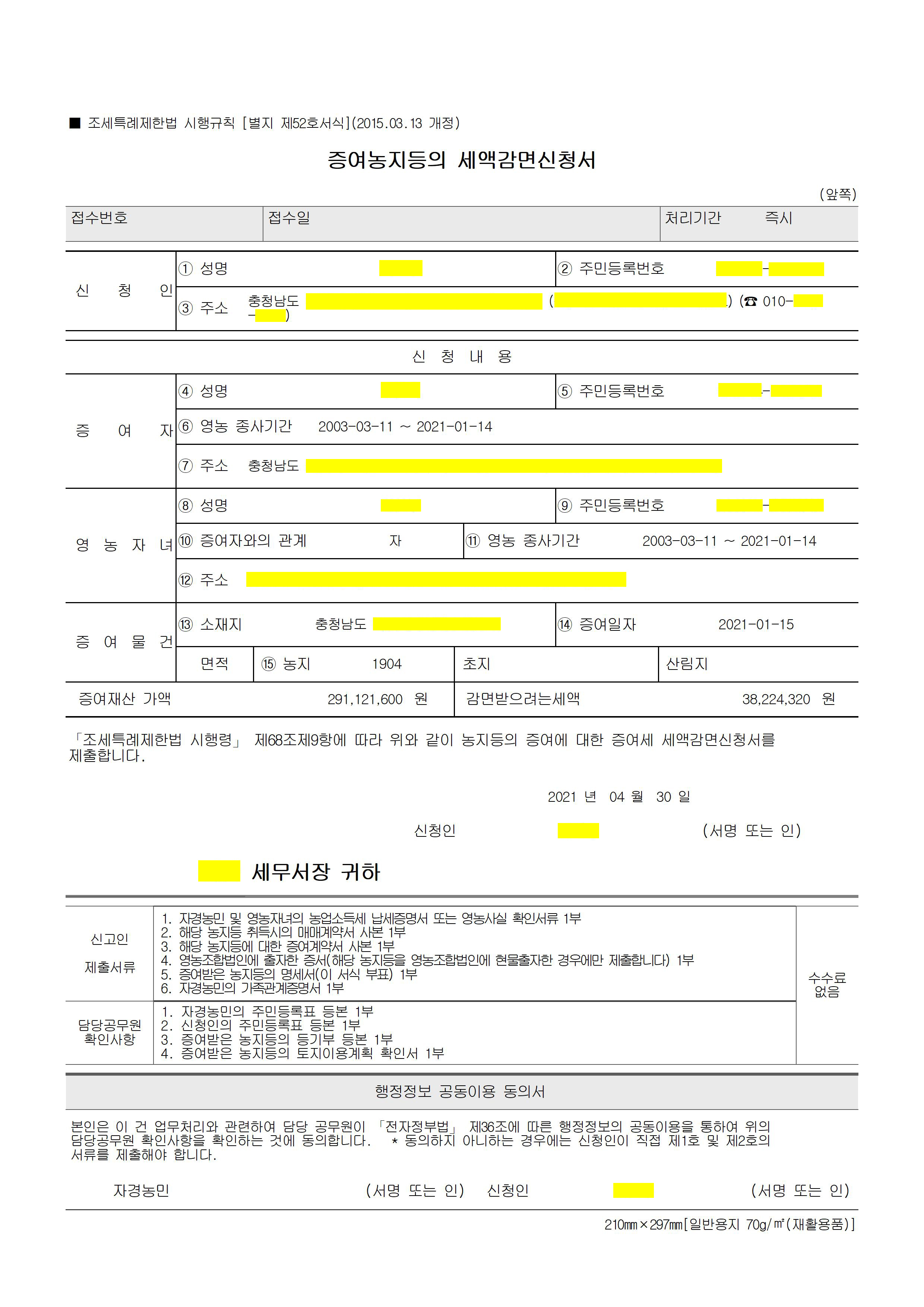 대통령령[조세특례제한법시행령 제68조[영농자녀등이 증여받는 농지 등에 대한 증여세의 감면(2018.02.13 제목개정) ]]