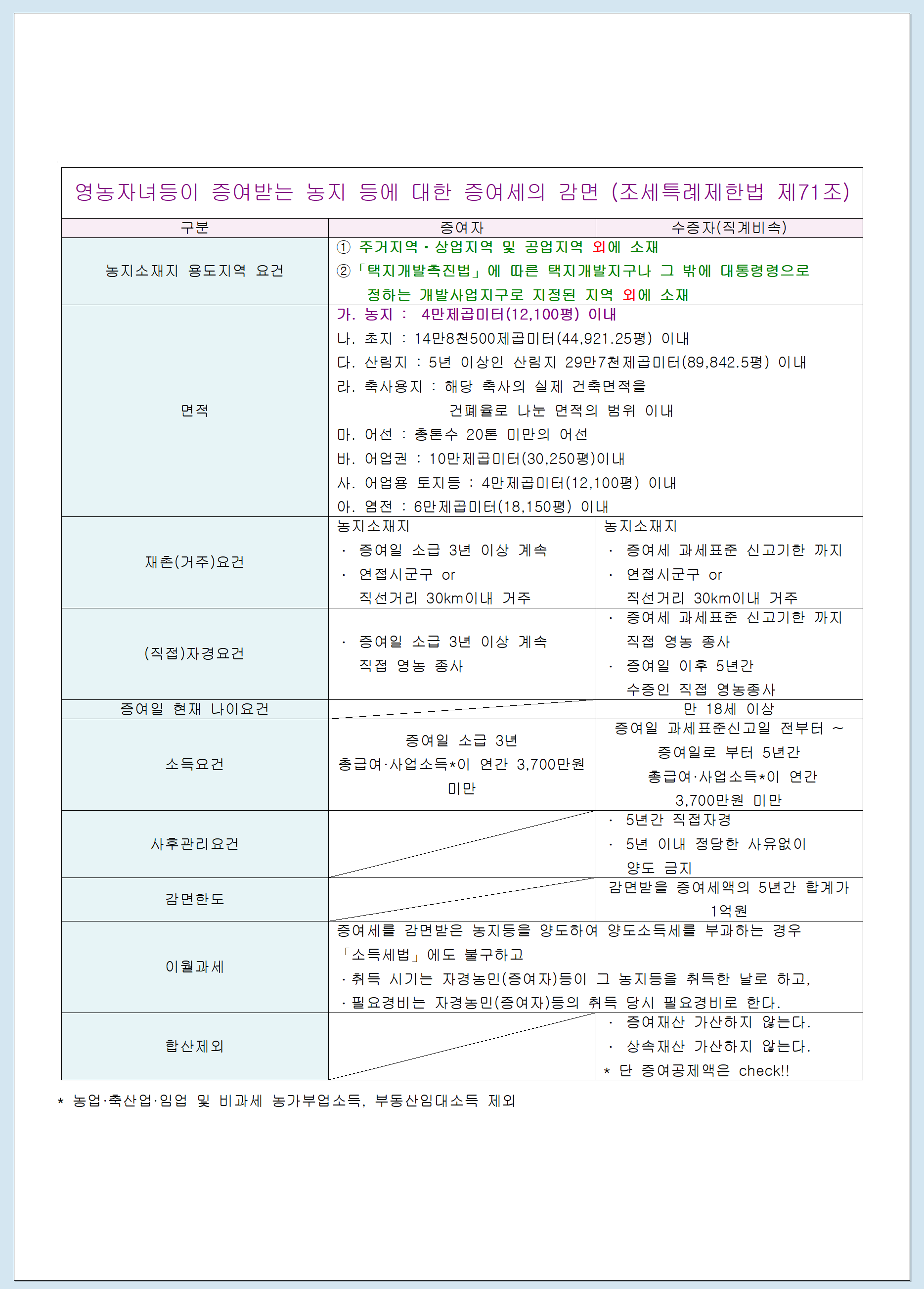 | □ 증여자 요건*, 사후관리** 등 * 증여일전 3년이상 계속 직접 재촌 경작 ** 5년간 증여받은 농지 계속 경작 | □ (좌 동) |